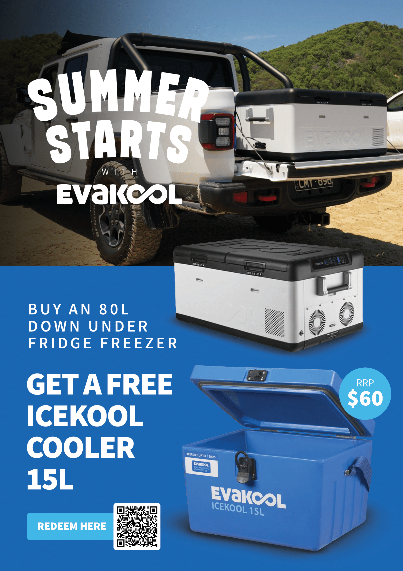 Claim a FREE Icekool 15L Cooler with every purchase of an Evakool Down Under II 80L Dual Zone Fridge/Freezer