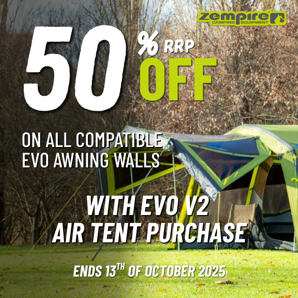 Now’s the perfect time! For a limited period, when you purchase a Zempire EVO V2 Air Tent, you’ll get the compatible Awning Wall Set at half price (RRP).