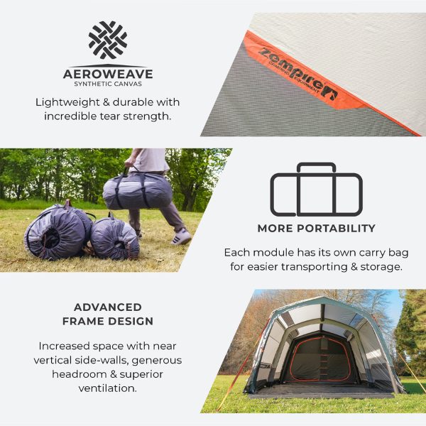Positioned at the top of Zempire’s polyester range, between the Pro and Canvas collections, the Shapeshifter Series offers a best-in-class balance of innovation, versatility and liveability. With its modular approach, campers can create countless unique configurations, reducing the need for multiple tents while expanding the possibilities of one.