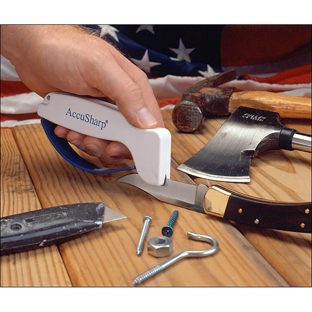 Finally, a Knife Sharpener anyone can use! No more messy oils or stones. In about 10 seconds, sharpen knives, (even serrated knives), cleavers, axes, machetes, and many other cutting tools. The large ergonomic handle fits either hand safely and securely. The full length finger guard protects your fingers. Sharpening blades are Diamond Honed Tungsten Carbide for years of reliable use. AccuSharp Knife Sharpeners will not rust and can be cleaned with soap and water or in the dishwasher.