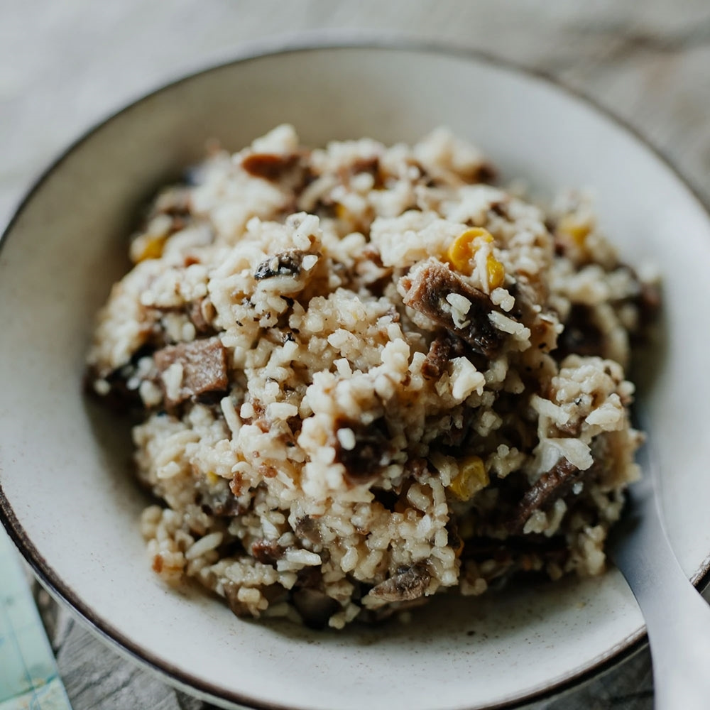 Rice, sauce [Maltodextrin, Thickener (1442), Milk & Cream Solids, Maize Starch, Yeast Extract, Dehydrated Vegetables, Sugar, Hydrolysed Vegetable Protein (Maize), Herbs & Spices, Acidity Regulator (330), Flavour, Colour (150d), Flavour Enhancer (635), Vegetable Extract, Salt], beef 20% [beef, salt, soy protein, stabilizer (450, 451), yeast extract],corn, onion, red pepper, canola oil