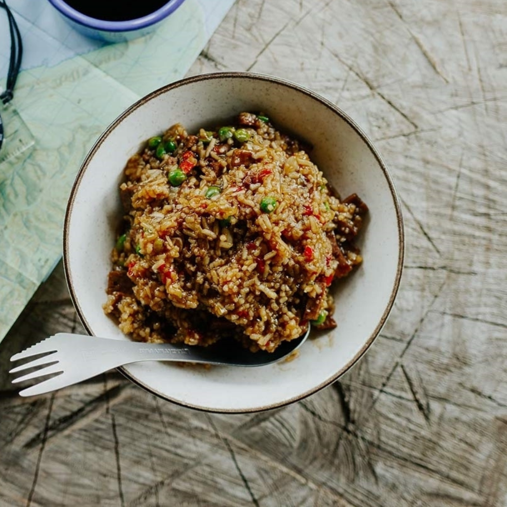 Rice, sauce [Maltodextrin (Maize), Thickener (1442), Sugar, Hydrolysed Vegetable Proteins (Maize, Soy), Dehydrated Vegetables, Herbs & Spices, Colours (150d, 100)], beef 20% [beef, salt, soy protein, stabilizer (450, 451), hydrolysed vegetable protein], peas, onion, red pepper, canola oil