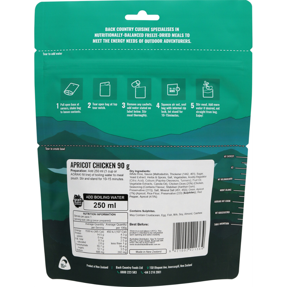 Nothing boosts morale after a long day on the trails quite like a hot, hearty meal. Back Country Cuisine’s Apricot Chicken is a freeze-dried take on the classic savoury casserole you know and love. Featuring tender diced chicken and sweet apricots served over fluffy rice, this New Zealand-made meal strikes the perfect balance of flavours. It isn't just about taste, though; this small-sized pack is a nutritional powerhouse, delivering 1530kJ (365 Cal) of energy and 14.5g of protein to help your muscles recover and keep you powered up for tomorrow's trek.