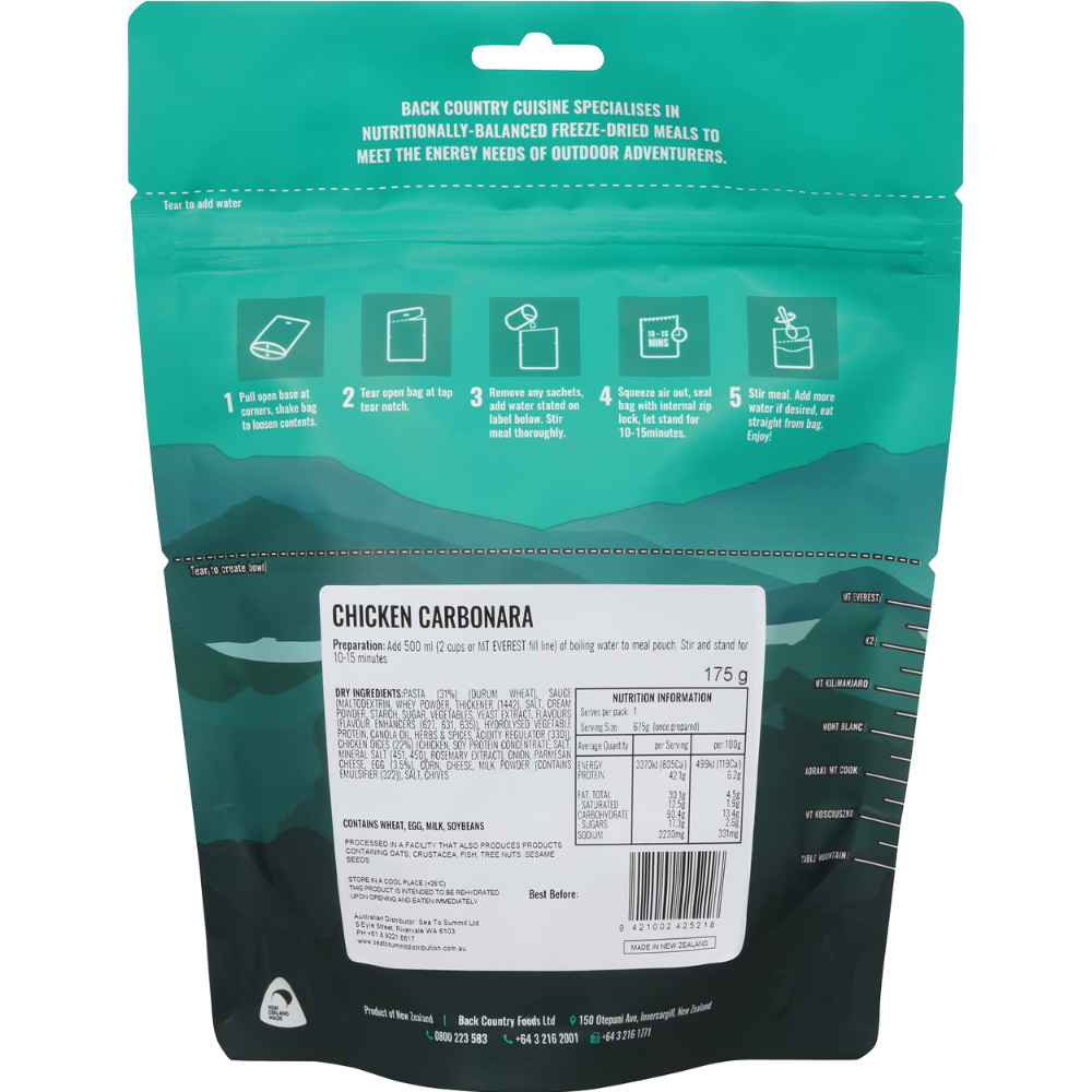 A freeze-dried chicken and pasta dish served in a creamy Italian style sauce! Simply add 500ml (2 cups) of boiling water. Stir and stand for 10-15 minutes!