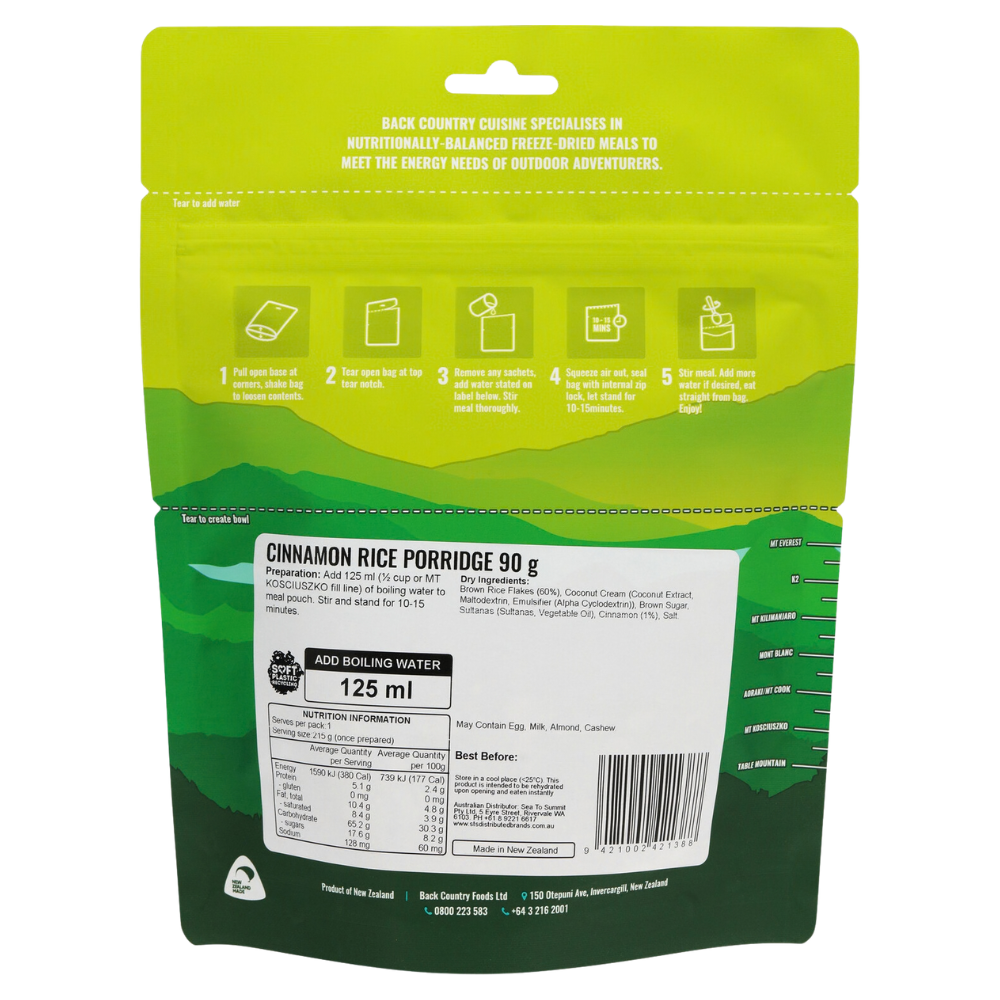 By blending rice flakes and creamy coconut with sweet sultanas and a touch of cinnamon, Back Country Cuisine creates a traditional porridge experience that is entirely Vegan, Gluten-Free, and Dairy-Free.