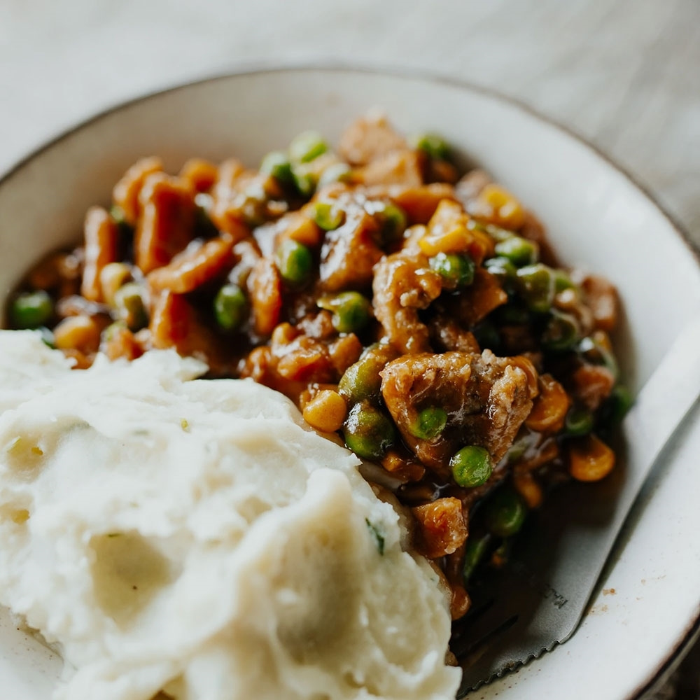 Potato (Potato (contains emulsifier (471), stabiliser (450), sodium metabisulphite (223), antioxidants (304, 320)), canola oil, whole milk powder, sugar, salt, chives), chicken 22%[chicken, soy protein, salt, stabilizer (450, 451)], sauce [Maltodextrin, Thickener (1442), Potato Starch, Rice Flour, Salt, Yeast Extract, Sugar, Hydrolysed Vegetable Protein (Maize), Colour (150d), Dehydrated Vegetables, Yeast, Acidity Regulator (330)], stuffing (breadcrumbs, egg, milk, onion, herbs, salt), peas, corn.