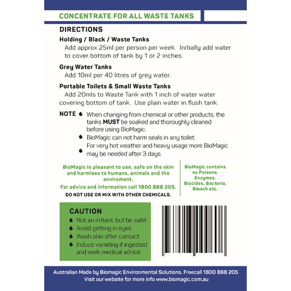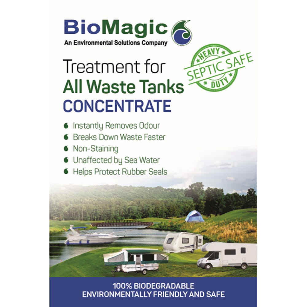 Suitable for all small portable toilets, cassette or holding tanks as well as grey water and septic waste systems, this new concentrate from Biomagic uses less per dosage and prevents the need to cart around extra weight and packaging!