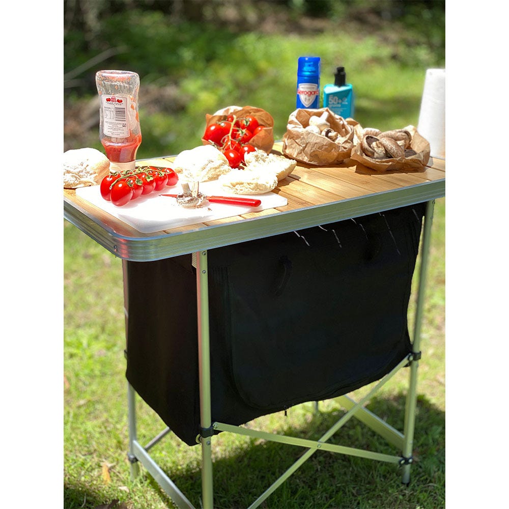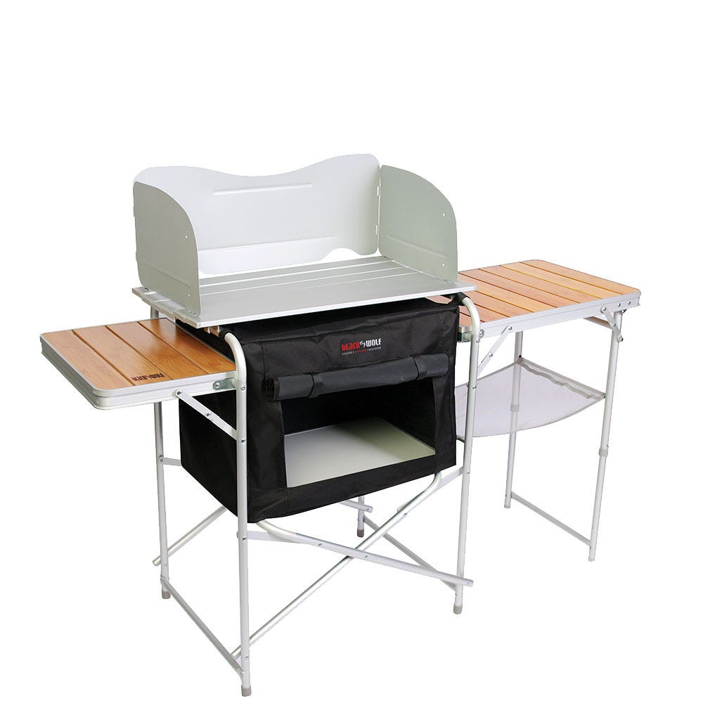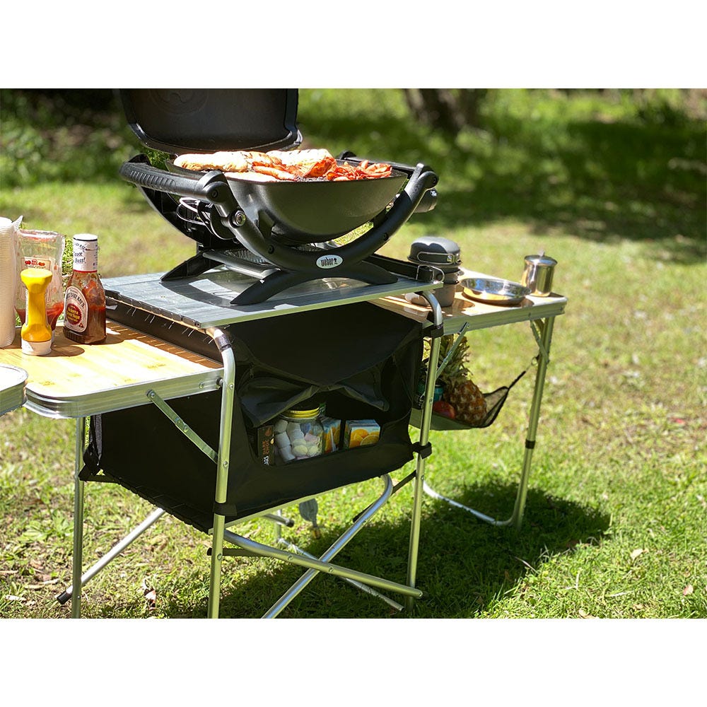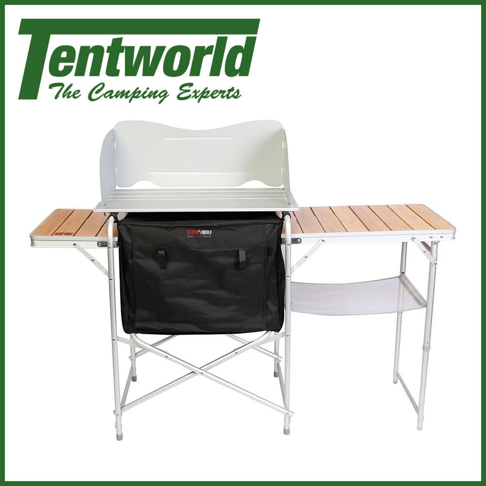 Featuring an aluminium frame, weather resistant slatted bamboo top surface, 600D polyester zip close cupboard with melamine shelves, a removable aluminium breeze blocker for the barbecue and finished with a mesh sling shelf, the new Camp Kitchen from BlackWolf is an elegant addition to the camp set up. Built to last, this camp kitchen is a step up from the everyday.