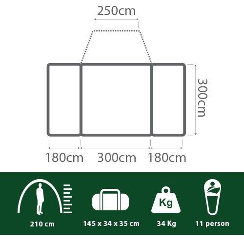 The Turbo Lite Twin 300 is the perfect tent for family camping. The large open floor plan provides great space and the room dividers allow the tent to be divided into 3 seperate areas, the two end rooms make ideal bedrooms whilst the centre allows for plenty of living space or a place for extra guests to stay.