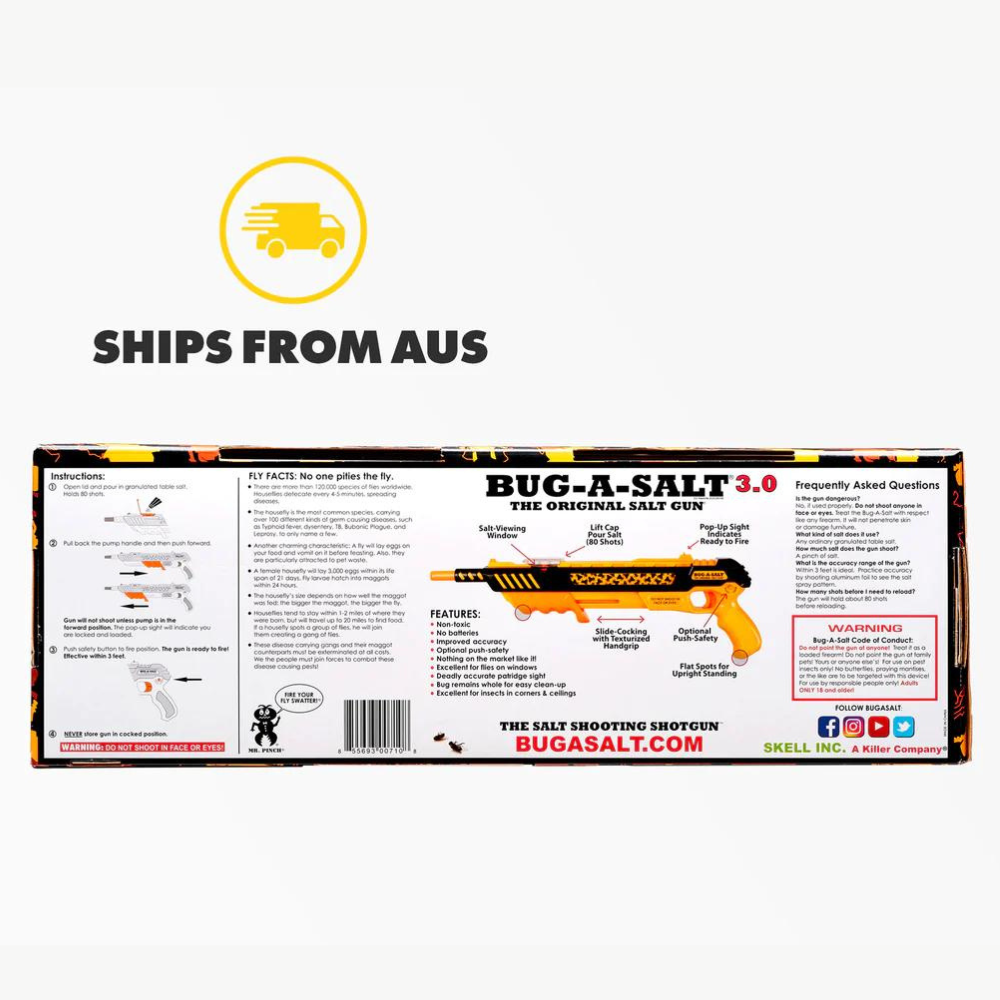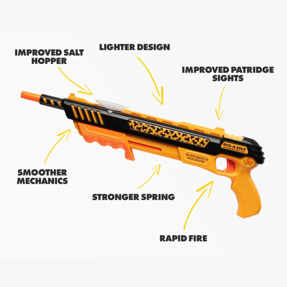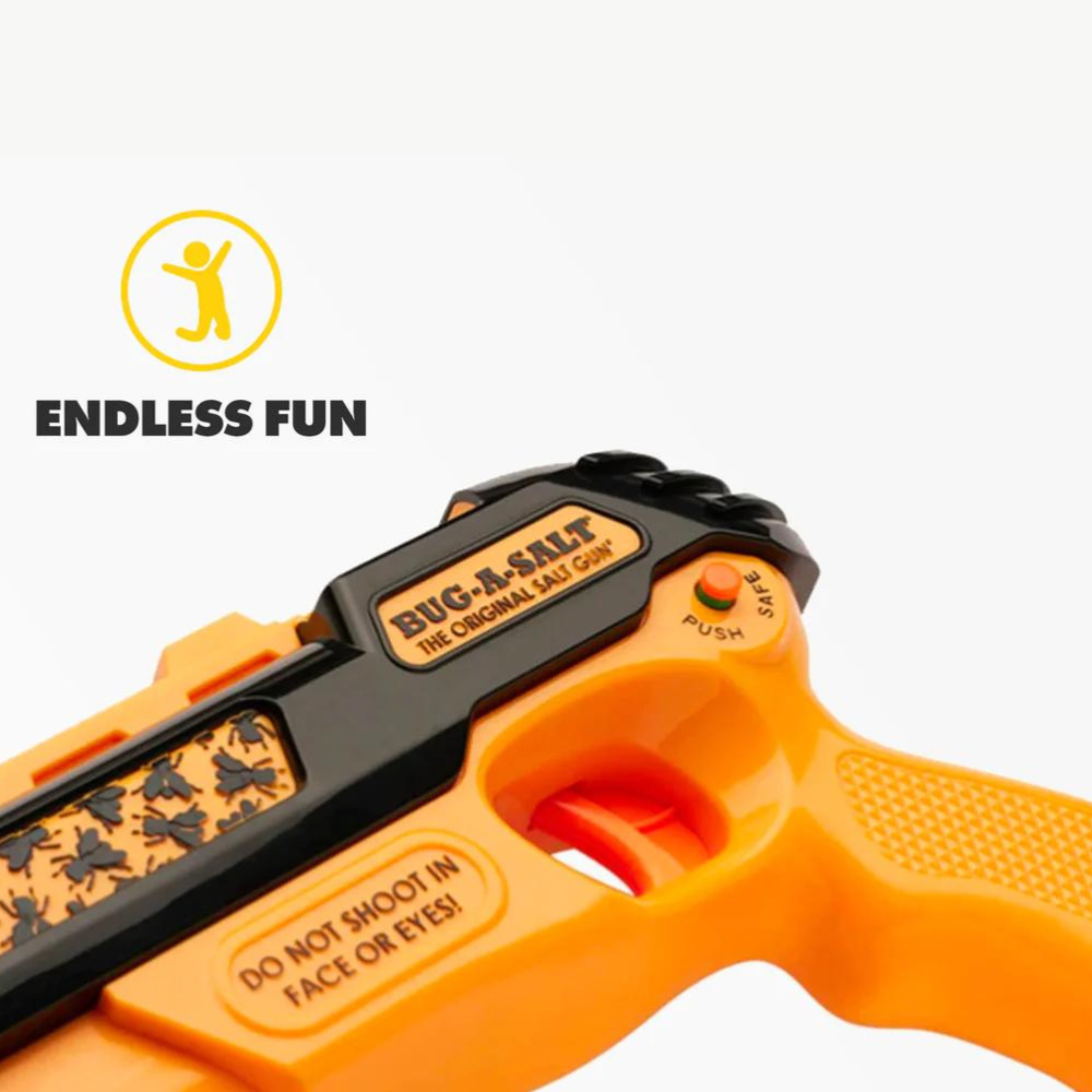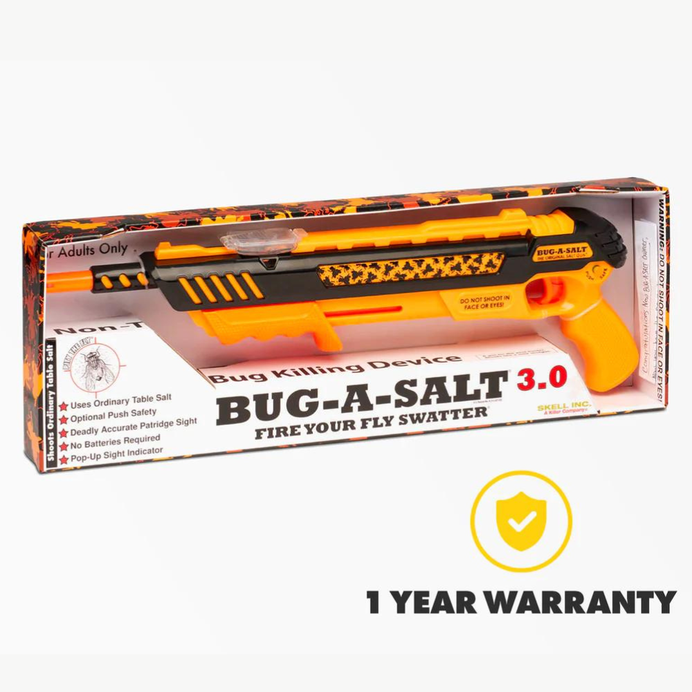 The BUG-A-SALT uses ordinary table salt to Blast Away Flies in an environmentally friendly way. With no harsh chemicals or Toxic Fly Spray. However, we must warn that instead of leaving flies whole for easy cleanup, it may splatter them.