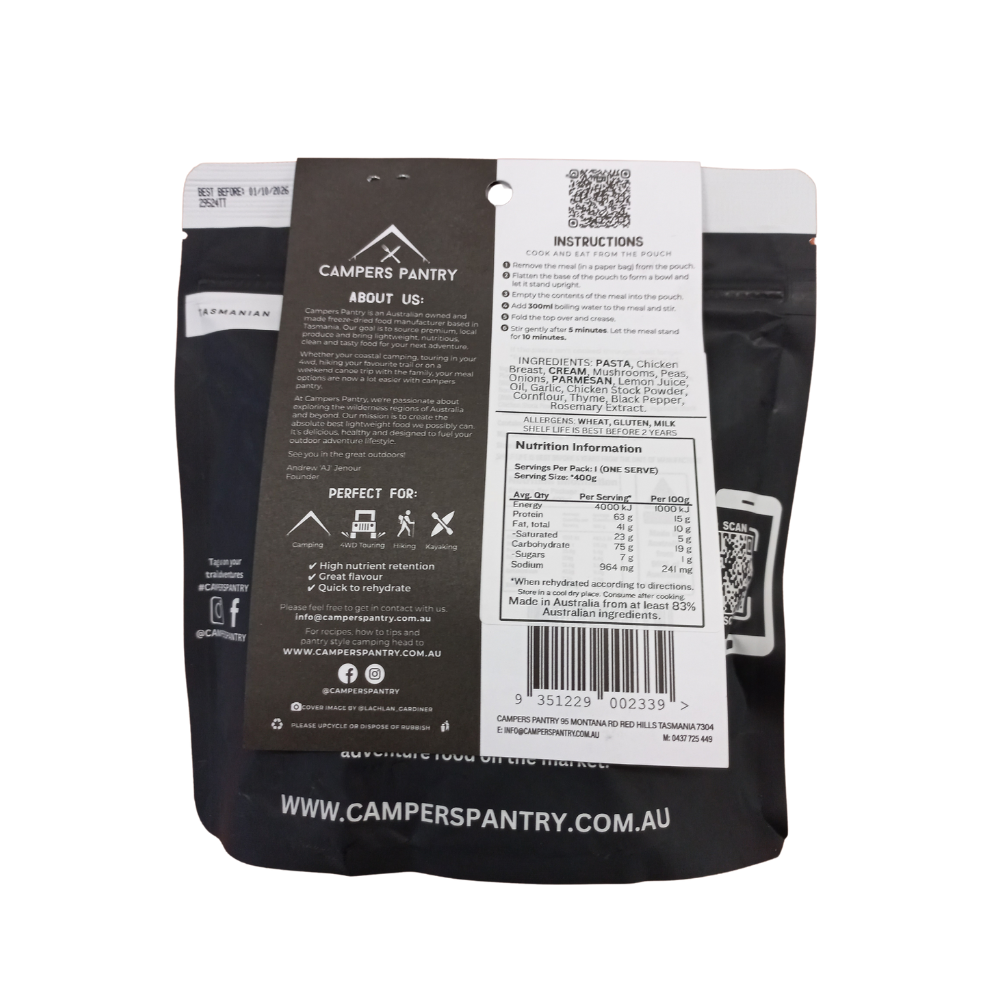 Satisfy your hunger after a long day outdoors with the ultimate comfort food – now in the ultra-lightweight MK II expedition pouch! The Creamy Chicken Pasta is a rich, hearty blend of tender chicken, earthy mushrooms, and a velvety, buttery sauce, all enhanced with a touch of cheese, parsley, and cracked black pepper for that home-style flavour hit.