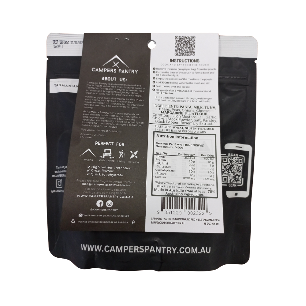 Satisfy your cravings with the MK II Tuna Pasta Bake, the ultimate comfort food for your outdoor adventures. Featuring savoury tuna and hearty mushrooms, this creamy, buttery pasta bake is drenched in a cheesy sauce with the perfect seasoning of parsley and black pepper. It’s the warm, filling meal you deserve after a day in the wild!