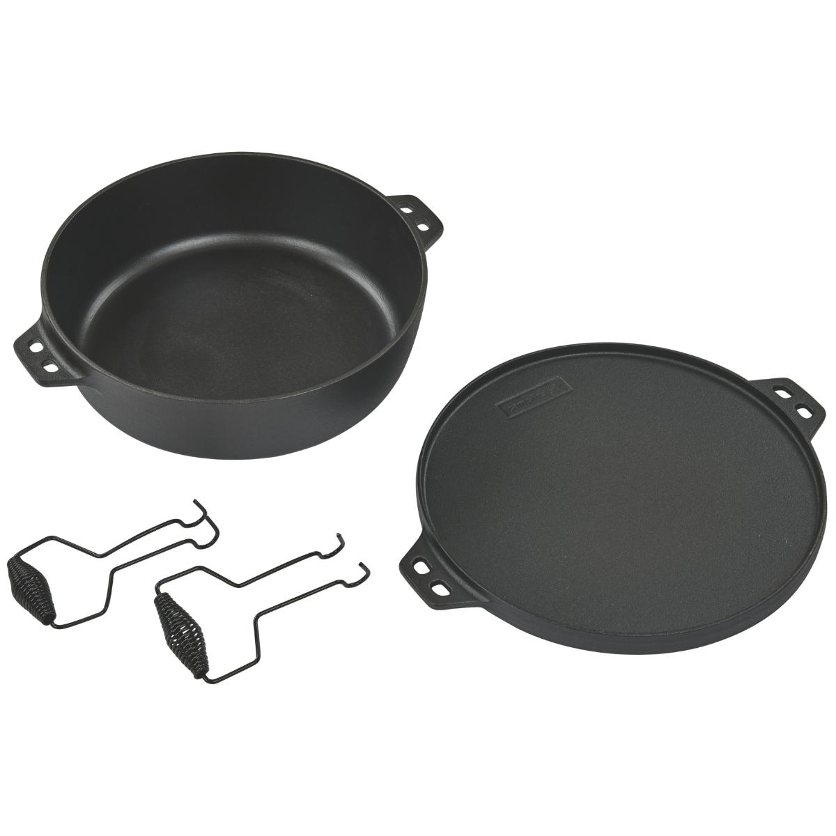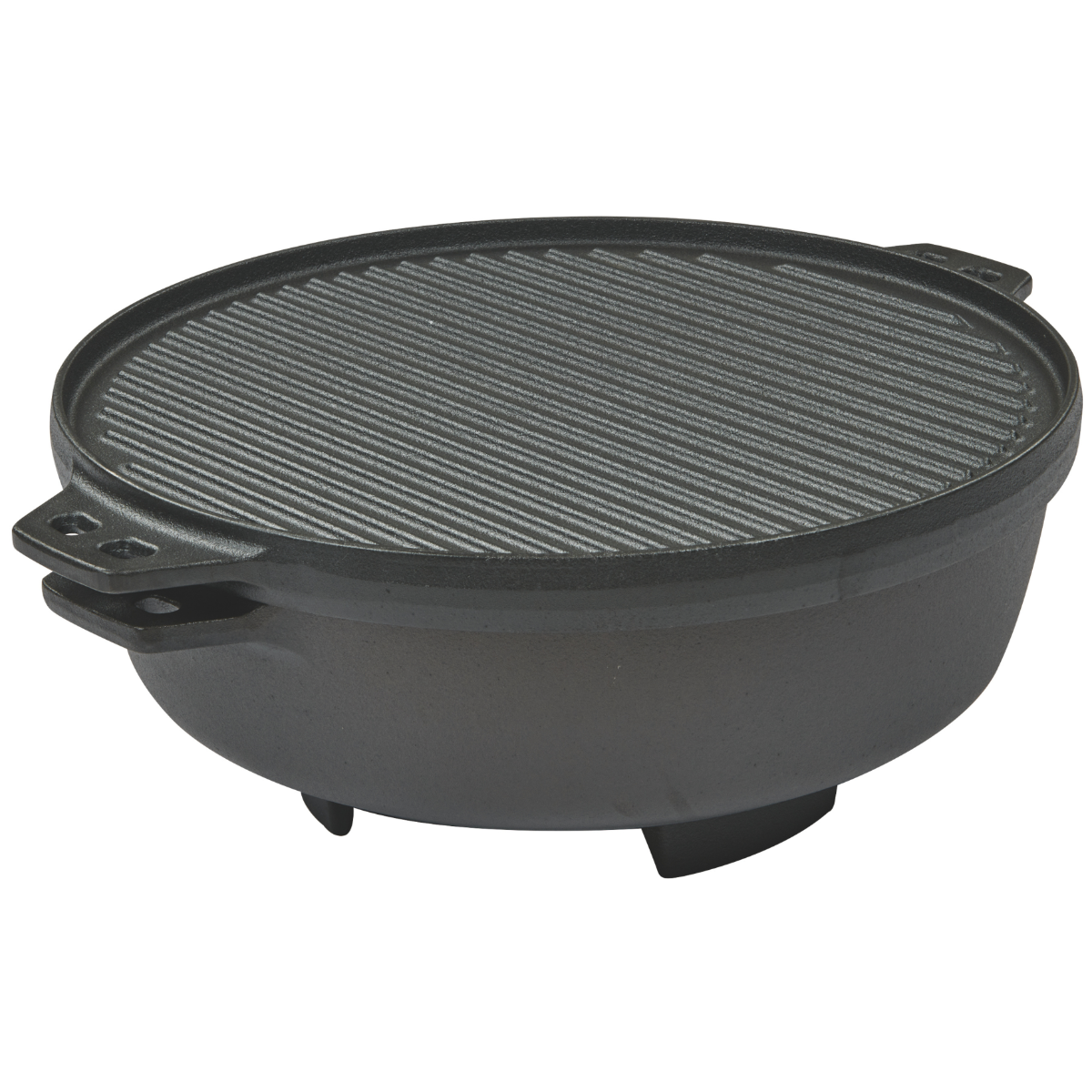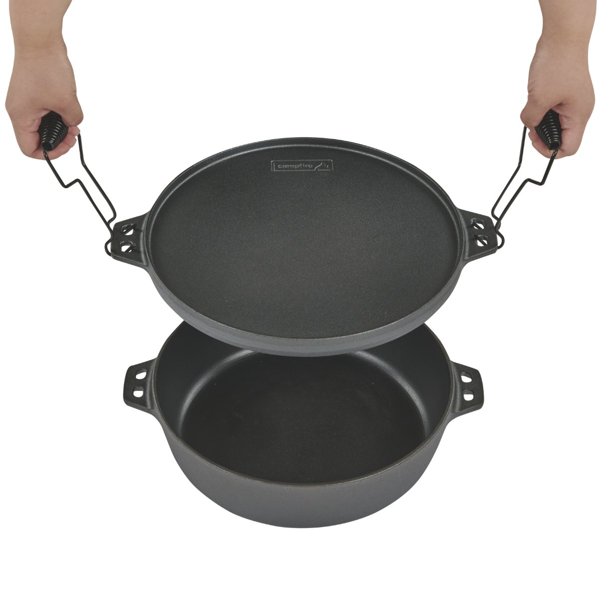 One camp oven, five possibilities. The 5-in-1 Camp Oven is the ultimately campfire cooking companion. Constructed from heavy duty cast iron, this versatile unit can be used as a grill plate, flat plate, wok, camp oven or pizza oven. The grill and flat plate act as a lid for the camp oven and base for the pizza oven. Simply invert the dome to create the perfect on the go oven. The two included lifting handles offers functionality while using the unit.
