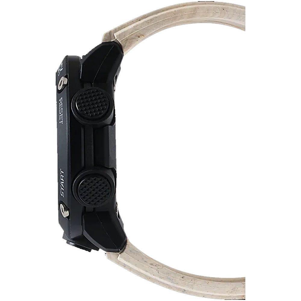 Button structure shock resistance has been improved, which eliminates the need for external button guards. The face of the watch consists of a disk pointer and raised hour markers for a look of bold toughness. This new standard-bearer of the G-SHOCK lineup combines a new shock resistant structure with urban outdoor styling that reflects its toughness.