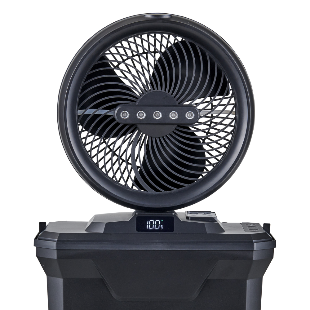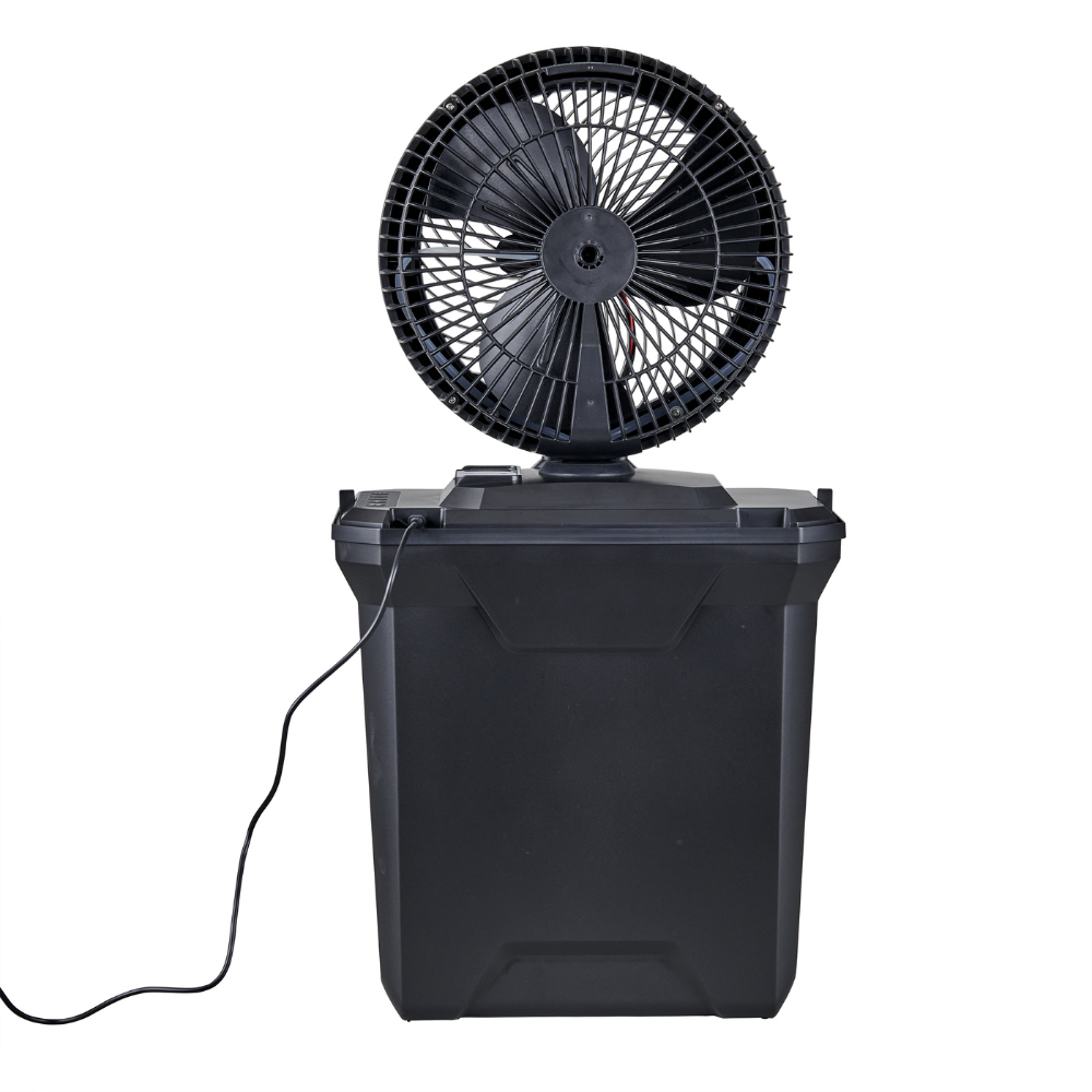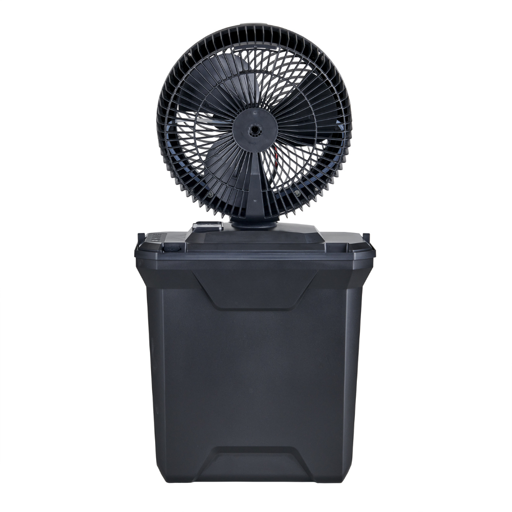 - The fan flips and stores easily inside the water tank for storage and features a built-in handle for easy transport.