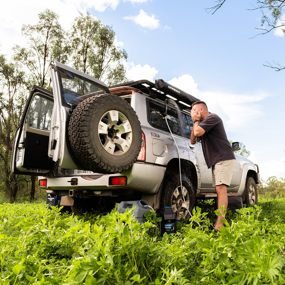 A slimline pump that fits most jerry cans, delivering strong 2L-per-minute pressure for consistent flow