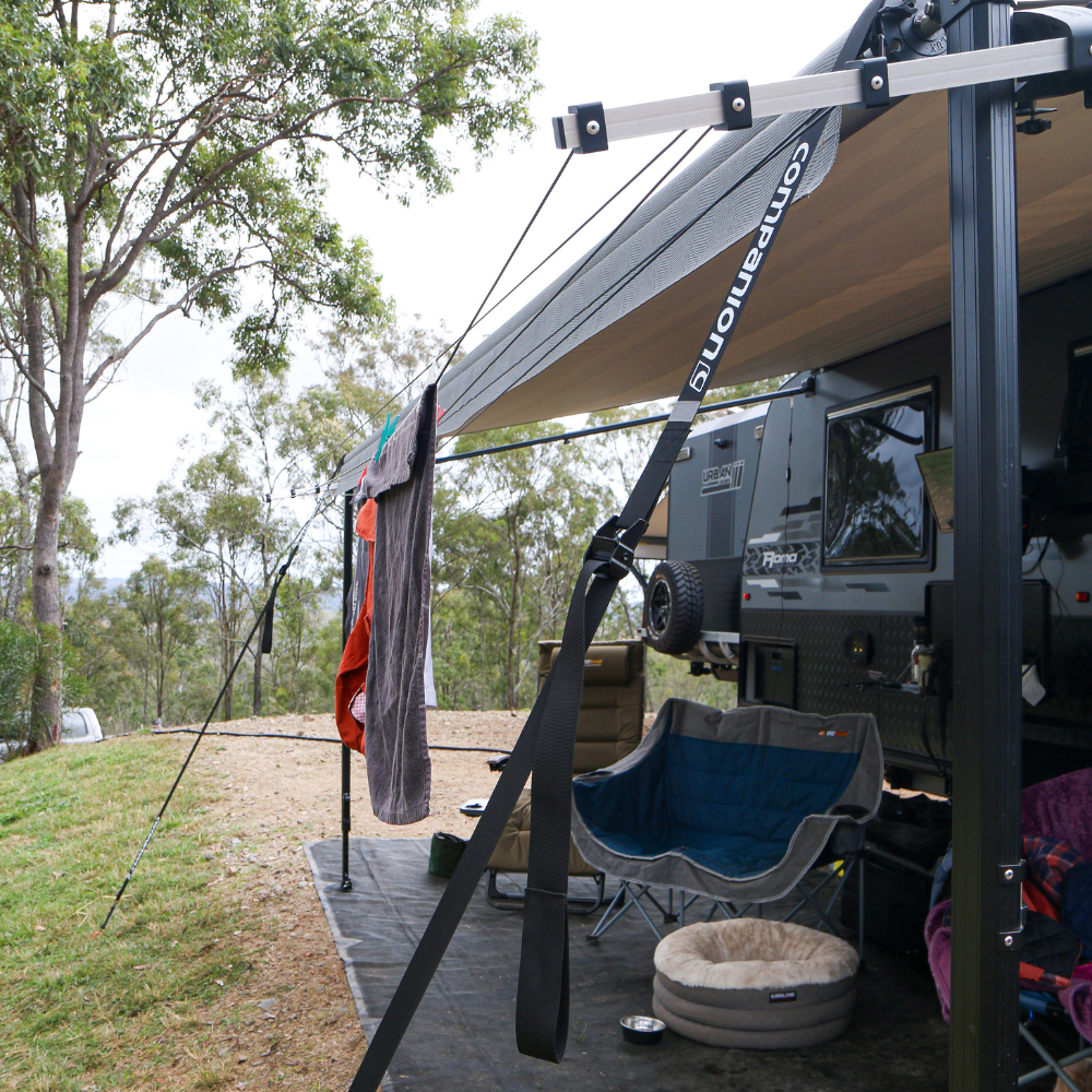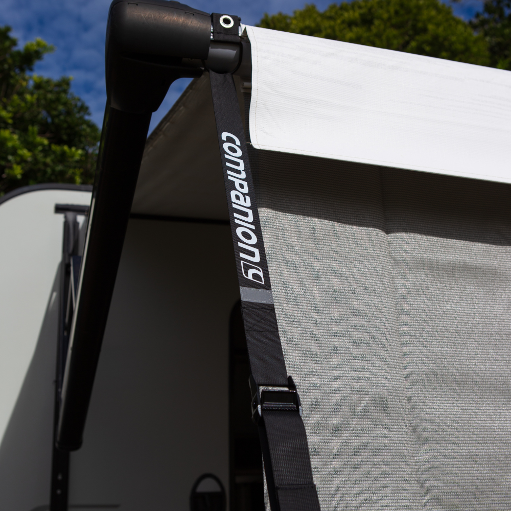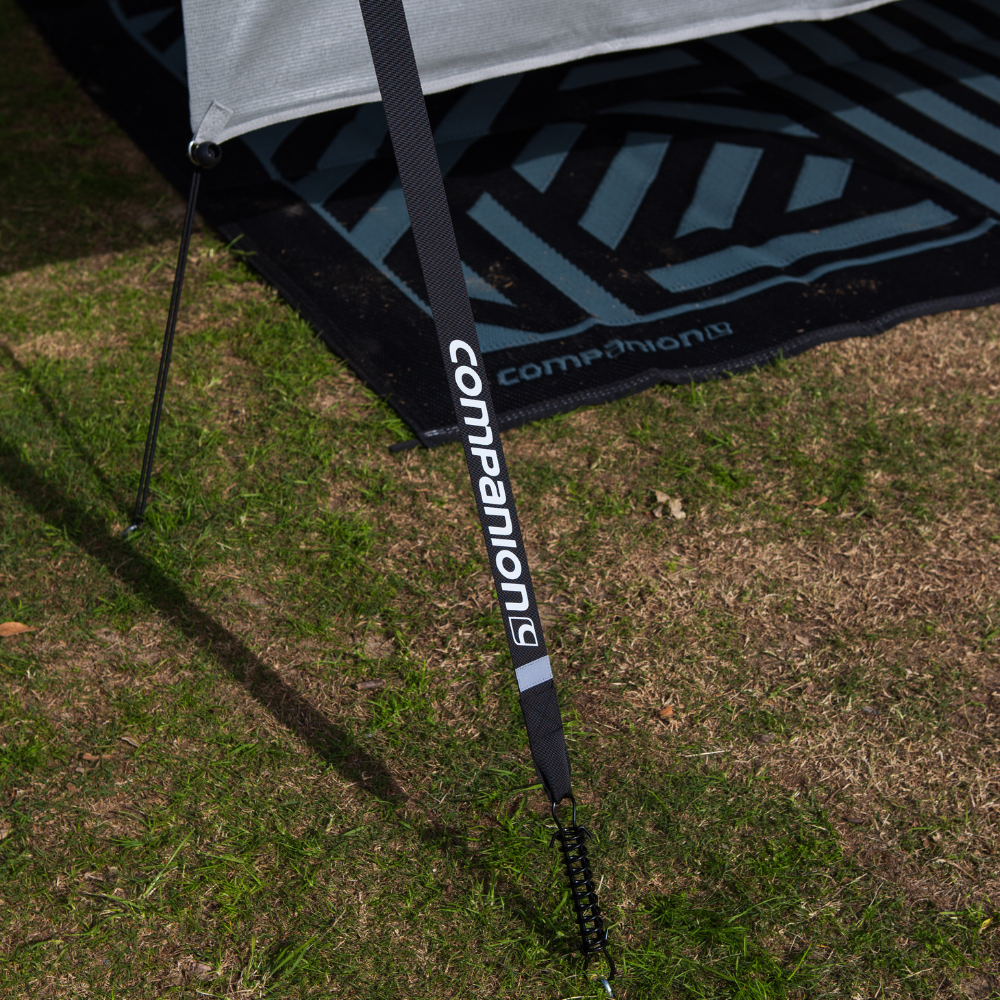 Crafted for versatility, the Companion Deluxe Awning Tie Down Kit is an essential addition to your touring setup, ensuring the protection of your awning. These straps serve as your ultimate defense against damage caused by windy conditions. Easily attach them to your awning using the stitched-in 5mm and 7mm splines or wrap them around the awning barrel and secure them with the included D buckle. Featuring durable powder-coated steel springs, heavy-duty 38mm webbing, and stainless steel eyelets, these straps are built to withstand outdoor climates. Use them with traditional tent poles with the included top eyelet or opt for extra strength with the adjustable D buckle to wrap around awning barrels. Reflective markings on the webbing enhance visibility in the dark, keeping your campsite safe.
