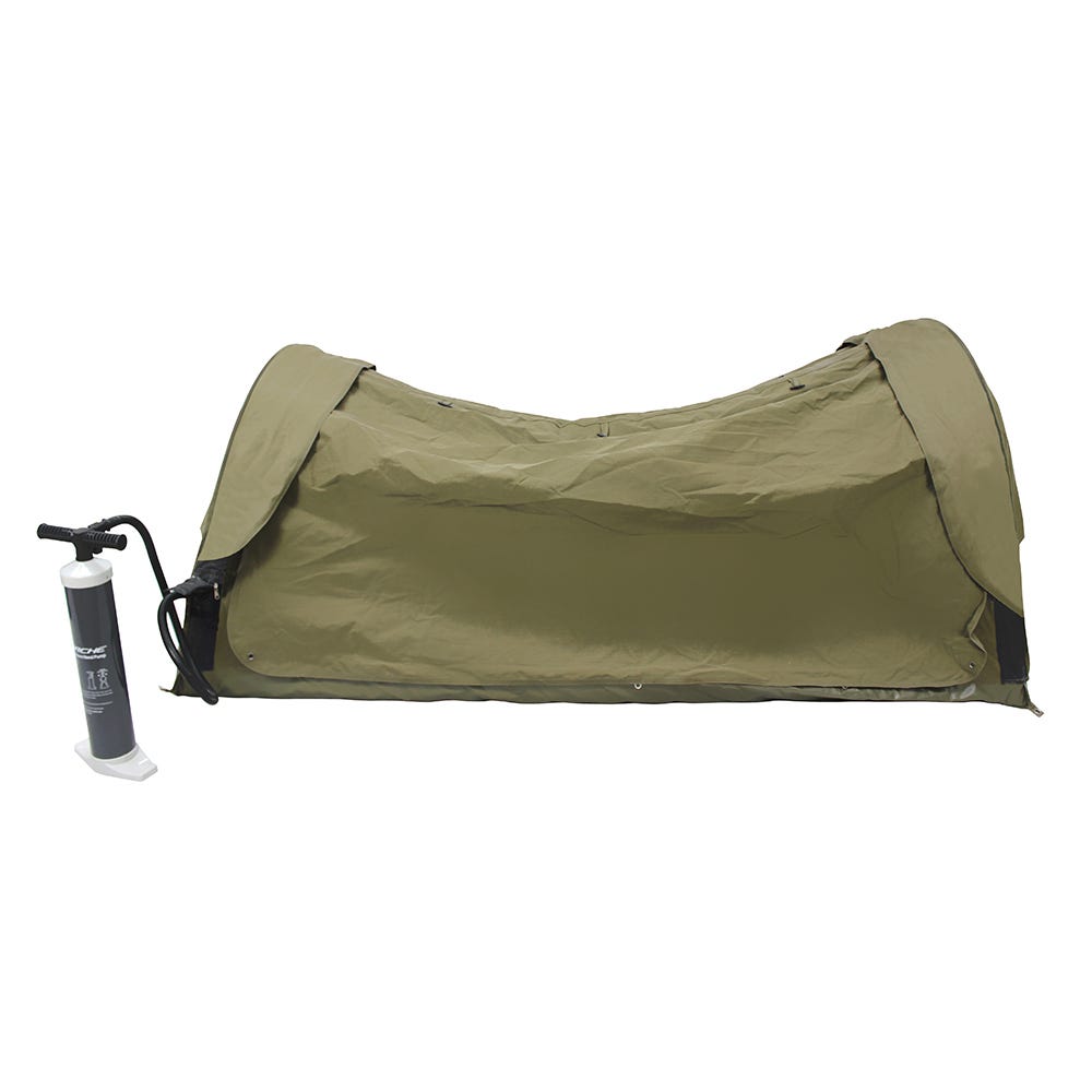 The next generation of the Air-Volution swags are almost here! Just when you thought it couldn't get any easier, the next generation AD swag will see campers and tourers setting up camp faster than ever before. With only one inflation point, the Air-Volution high capacity hand pump will inflate the entire swag in less than 20 seconds! With a single inflation point and puncture resistant air poles, you won't have to worry about setting up times or emergencies! The Darche Air-Volution Swag AD - 1400 has a two way entry with storm covers/awnings (poles not included), and comes with a high capacity hand pump! The seam sealed 260gsm ripstop canvas and reinforced 600gsm PVC bucket floor is durable and suitable for tough conditions, and the swag includes a 50mm mattress!