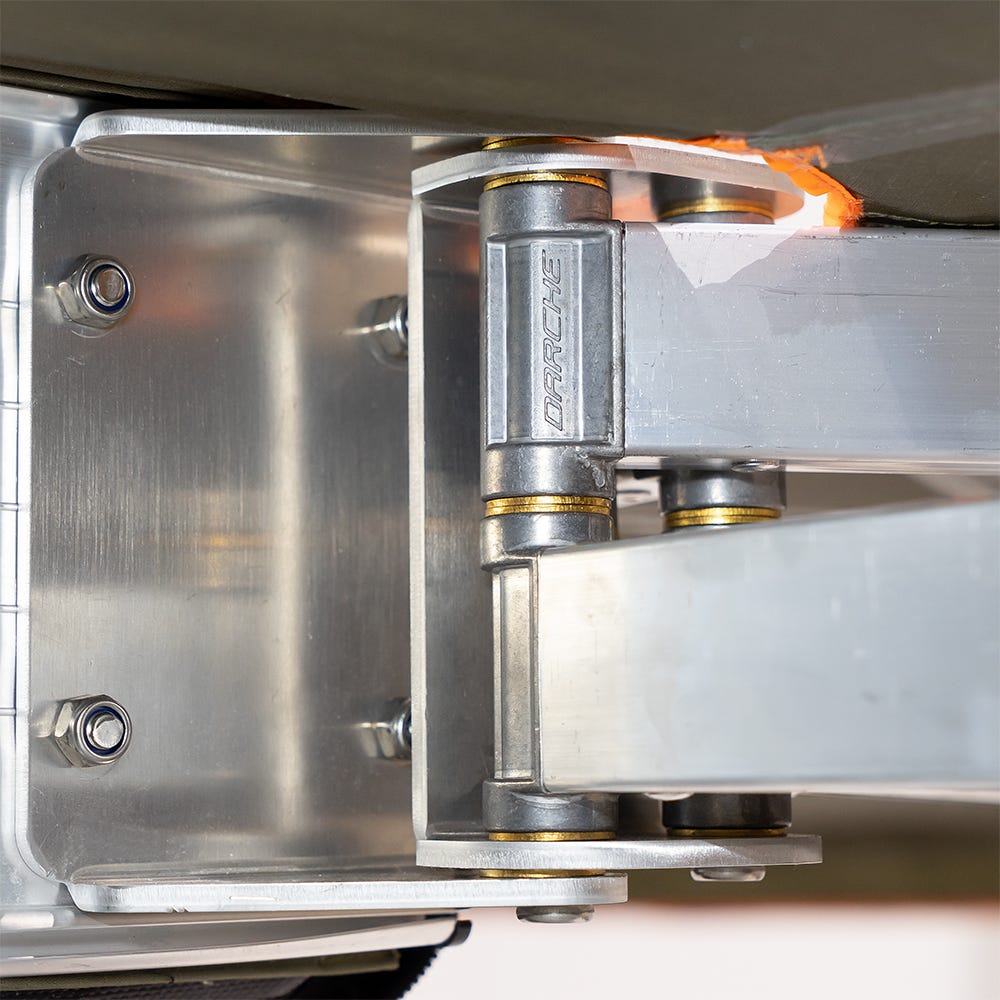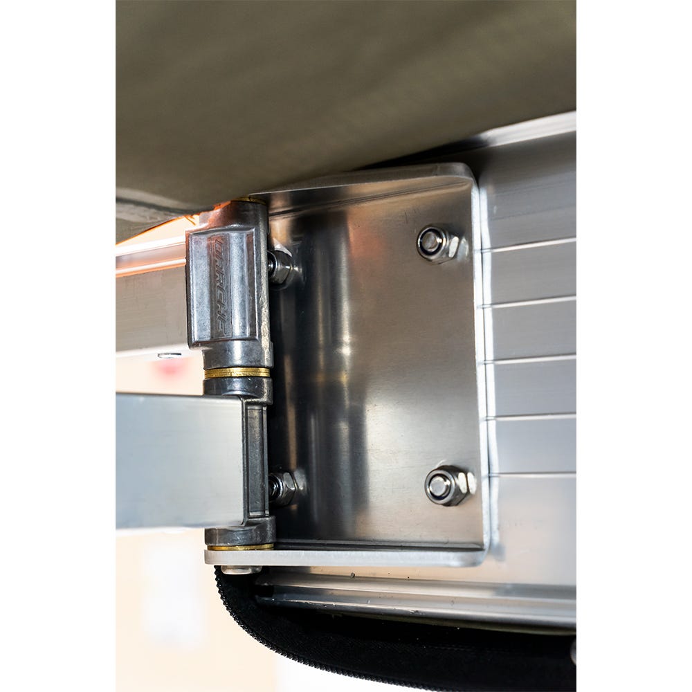 - (New) Aluminium hinge system. Hinged from both ends, the awning spans 6m along the side of the vehicle
