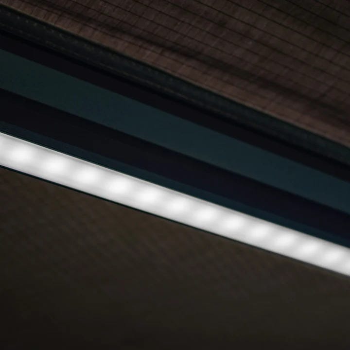 Covering an expansive 11.5 square meters and enduring wind speeds of up to 30km/hour without the need for poles or pegs, this awning includes a fully enclosed transit cover and a two-piece backing plate to optimize weather resistance. Thus, it remains reliable through wind, rain, and sunshine. Moreover, adjustable brackets accommodate various setups, while integrated dimmable white and amber LED lighting on four rafter arms ensures dynamic lighting options after dark!