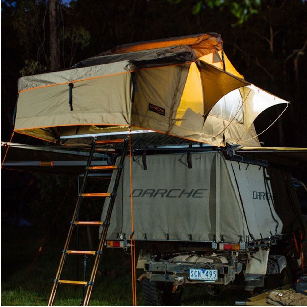 NOTE: Darche rooftop tents don't have a weight rating, the roof rack needs to be rated as this supports the roof top tent. The ladder must always be grounded when the rooftop tent is in use.