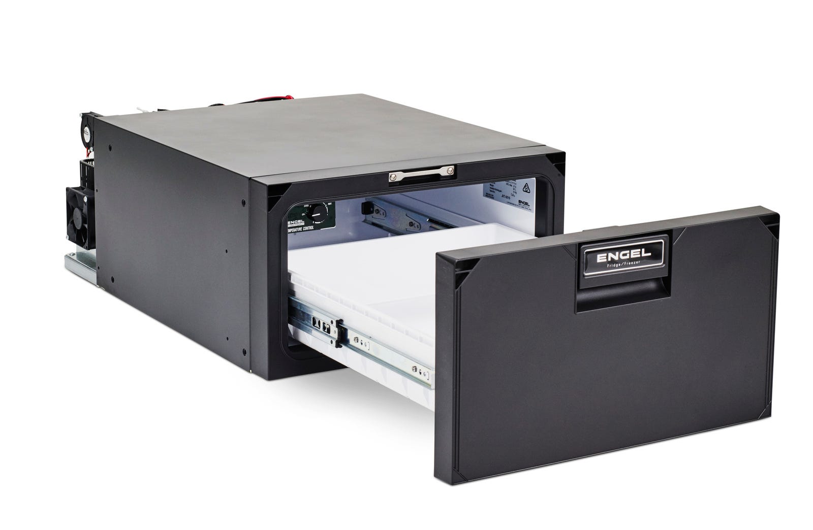 The Engel Drawer Fridge SB30F - 30L is designed to be installed into your vehicle or boat for portable cooling on your next adventure. It's manufactured with quality materials, featuring a full steel cabinet construction, stainless steel runners and Engel's famous Sawafuji Swing Motor, known for it's reliability, this motor ensures efficient cooling.