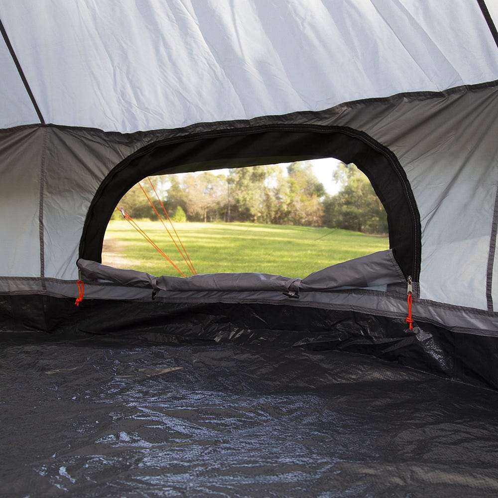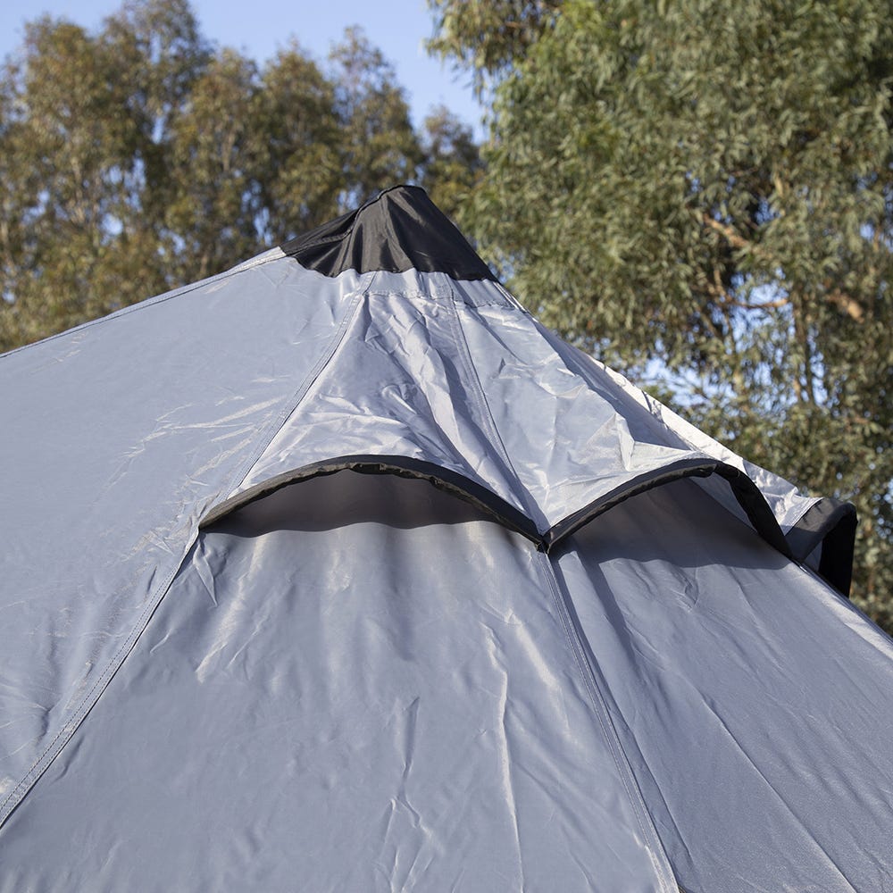 The large multi-purpose and open living area offered by this tent stretches a massive 4 metres in diameter, providing you with buckets of space to bring in some luxuriously-sized bedding for two. For families or larger groups, the expansive floorspace can house up to 8 adults. Power cord entry allows you to run powered appliances indoors and the high hanging points provide the perfect spot for draping some soft lighting to create a truly magical experience.