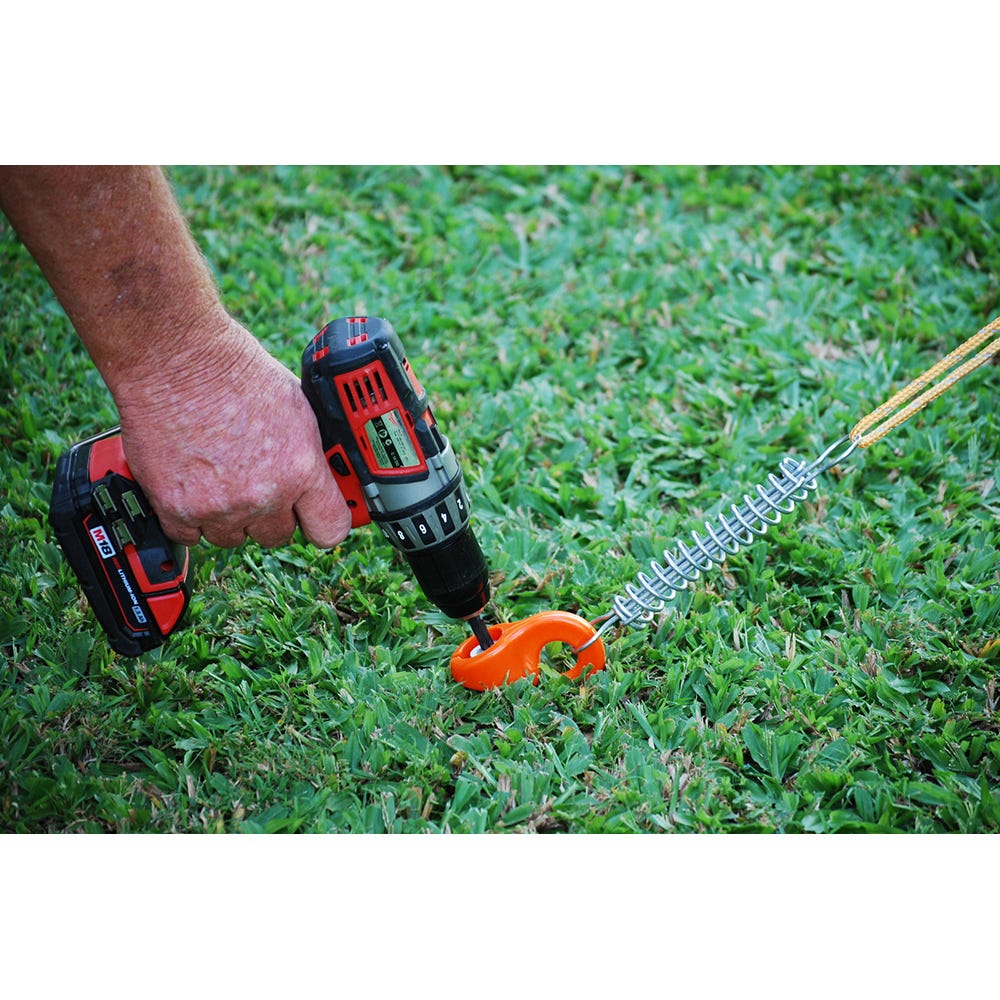- Hold the hook and guy rope in one hand, place drill in reverse and unscrew.