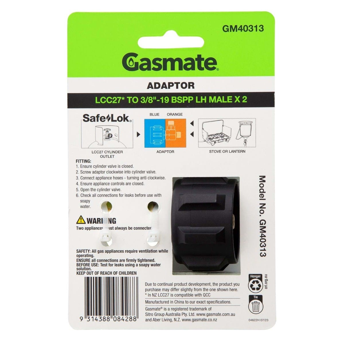 Gasmate is committed to enhancing your BBQing and camping experiences with added convenience and safety. Gasmate have a comprehensive range of gas adaptors and accessories for your needs. The GM40313 Adaptor allows you to convert an LCC27 outlet to two 3/8"-19 BSPP-LH outlets.