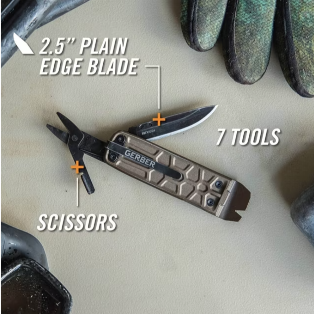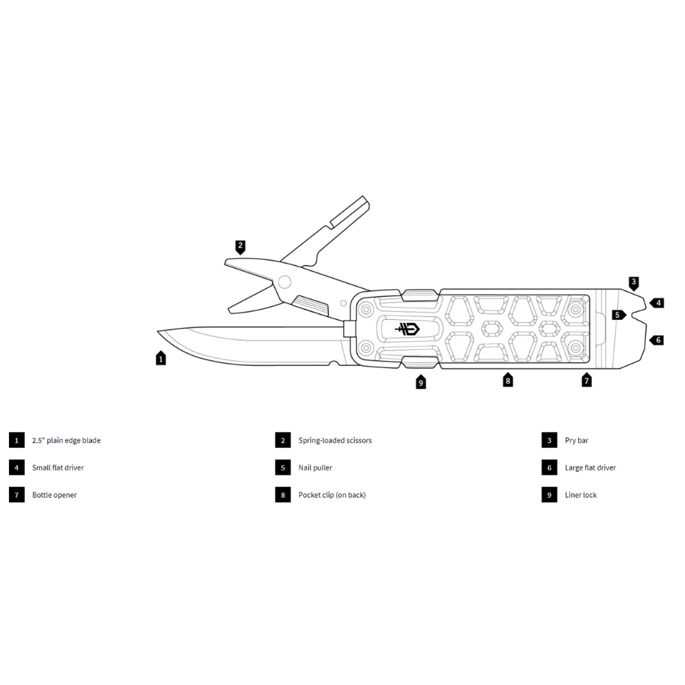 • Tools include a 2.5” plain edge blade, spring-loaded scissors, cast pry bar, bottle opener, and more.