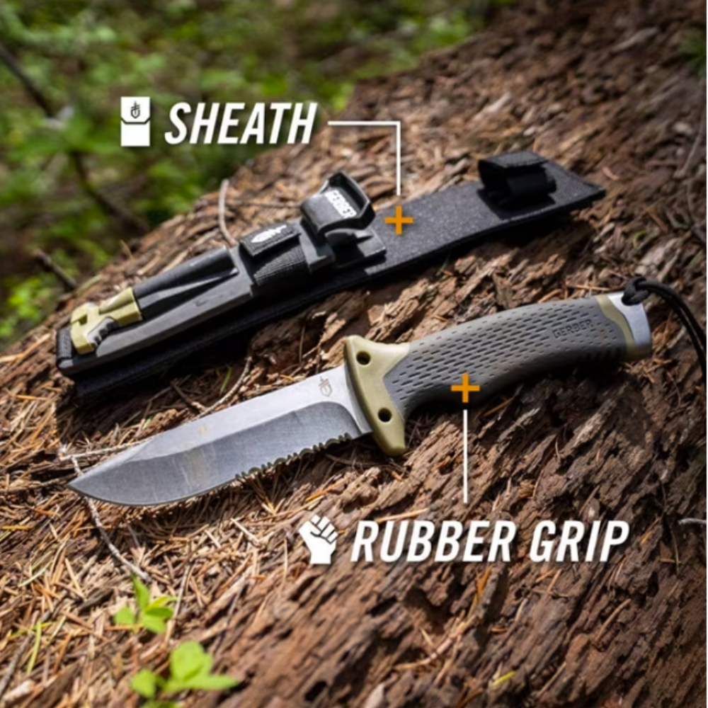 Loaded with innovations, this knife has everything. The Gerber Ultimate Survival Knife features a half serrated, drop point blade, a textured rubber grip, a steel hammer pommel, and an emergency whistle. The durable sheath has a sharpener and a firestarter.