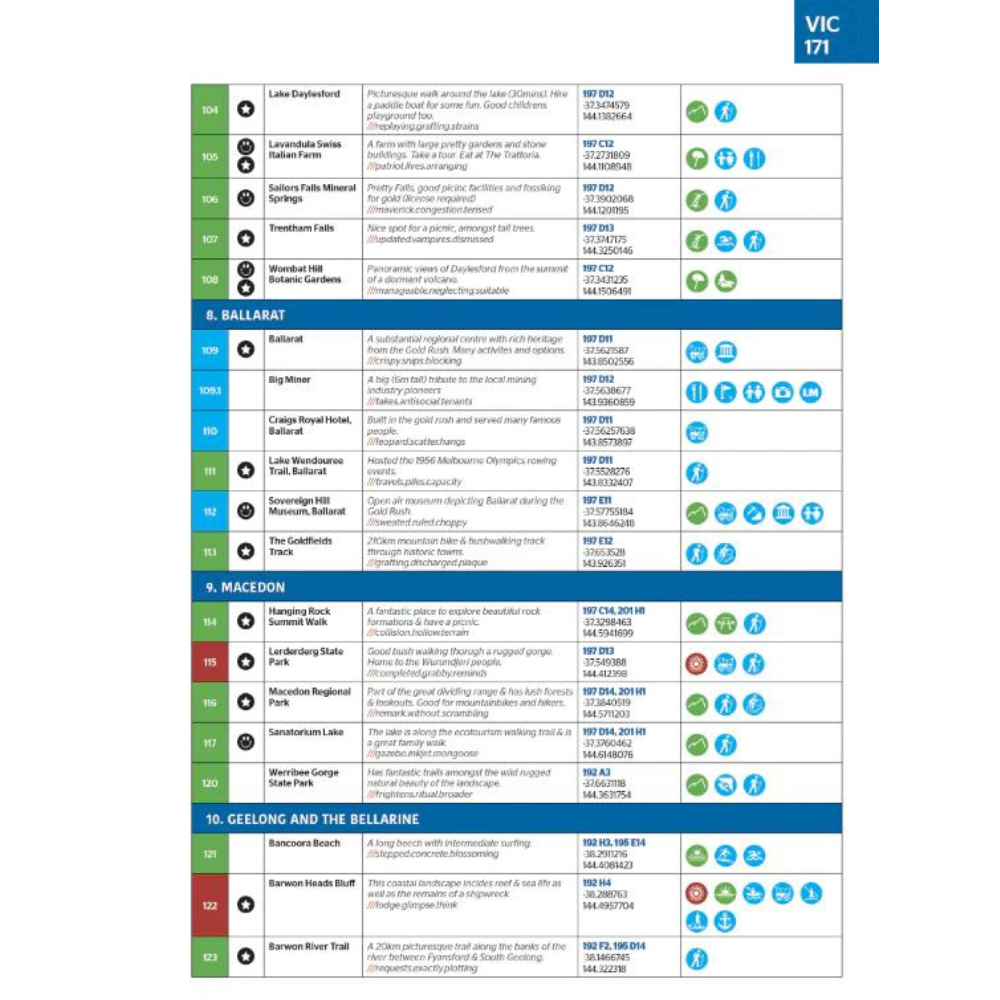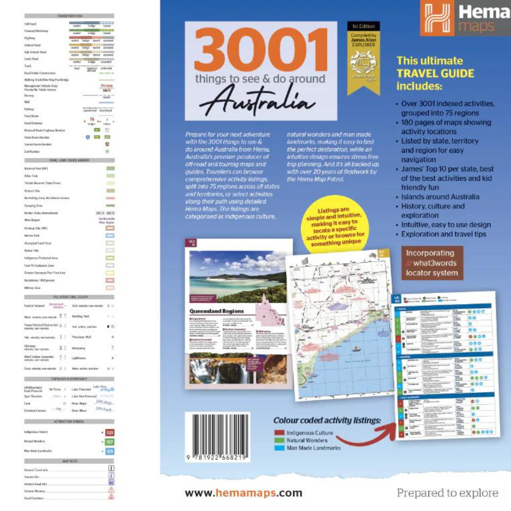 There are thousands of activities in Hema’s first edition of 3001 things to see & do around Australia. Compiled by Explorer James Allen, this book makes it easy to plan your activities and routes, thanks to the use of activity icons combined with Hema’s award-winning cartography. The activities have been combined into the following 3 types; Indigenous where there is an indigenous experiences, indigenous art or indigenous history Natural Wonders which is purely nature with no or limited influence by humans eg: geology, fossils, forrests, waterfalls, coral reefs, beaches, animals and sunsets Man Made Landmarks where there is a man made component to that thing to see or do eg: classic drives, museums, botanical gardens, lighthouses and historic monuments
