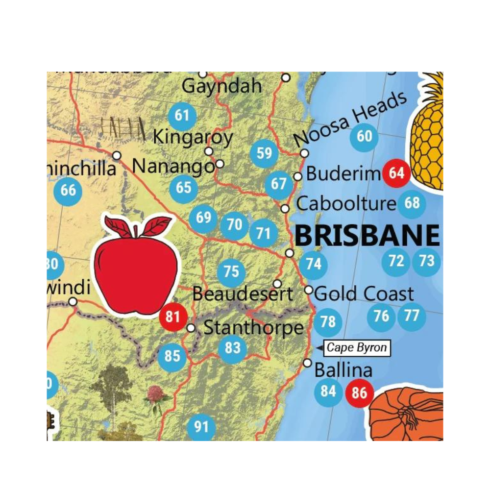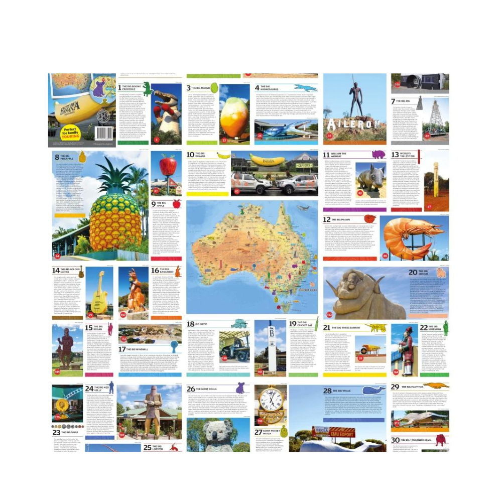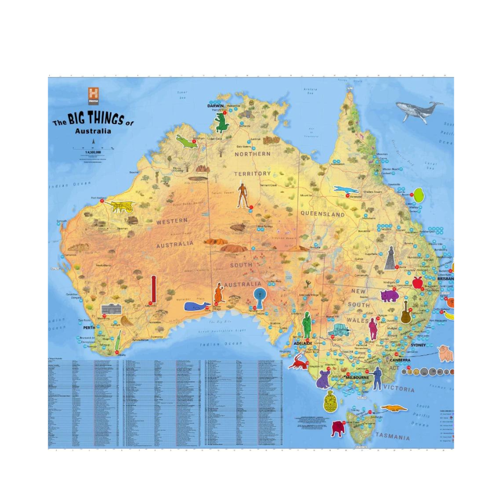 This colourful and easy-to-use map of Australia is the only map on the market featuring a full list of the big things of Australia and includes Hema's top 30 icons prominently displayed on the map plus a description of each on the reverse side of the map.