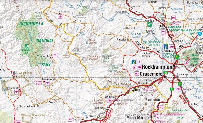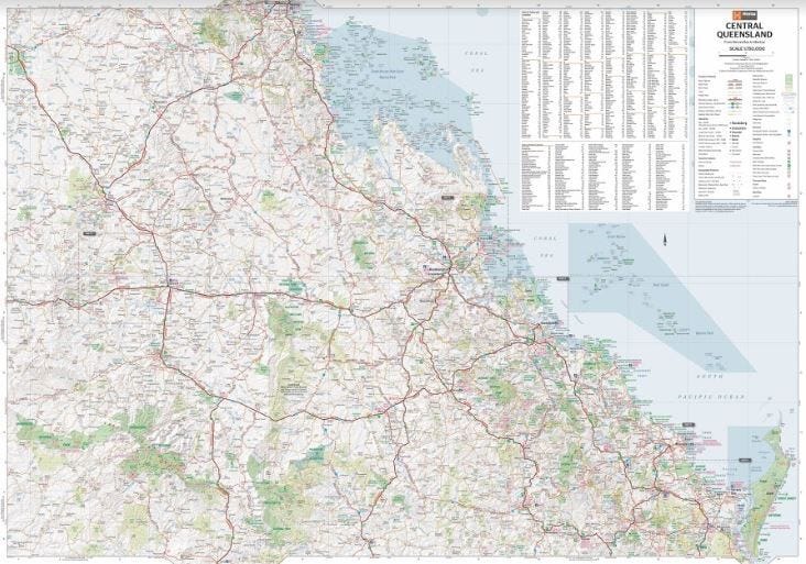 - One side shows tourist information on the region, inset maps of Mackay, the Capricorn Coast, Gladstone, Bundaberg, Rockhampton, and the Gemfields