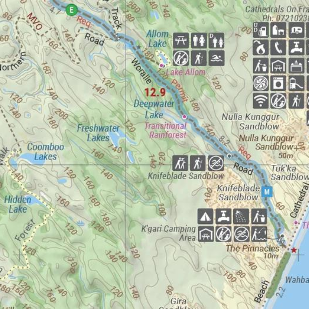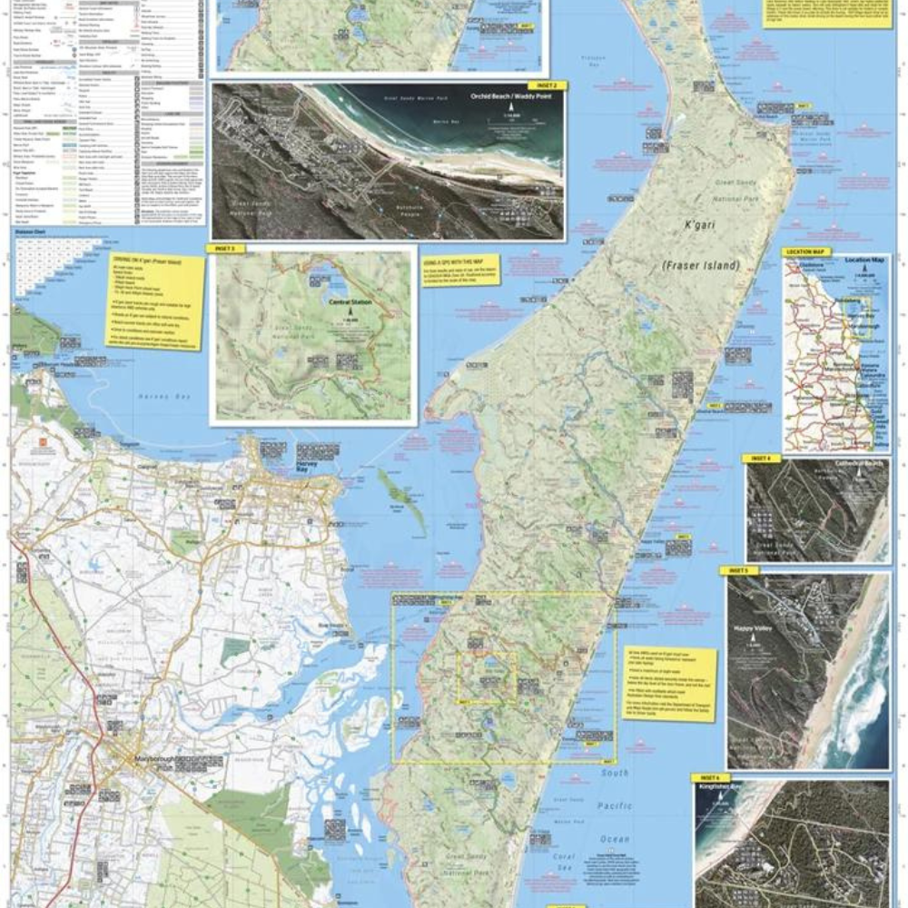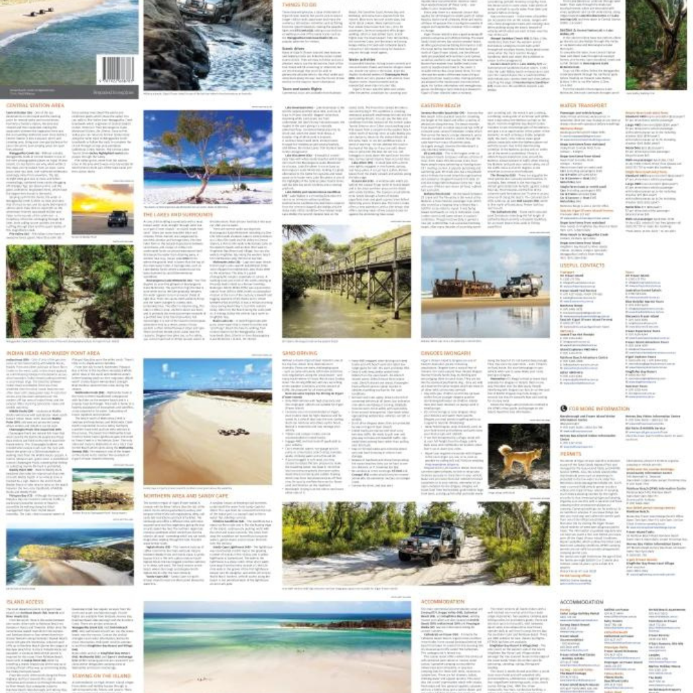 On the reverse is a wealth of information for enjoying Fraser Island (K'gari), including touring information on each distinct region, things to do, island access, permit information, accommodation, useful contacts and helpful insights for sand driving.