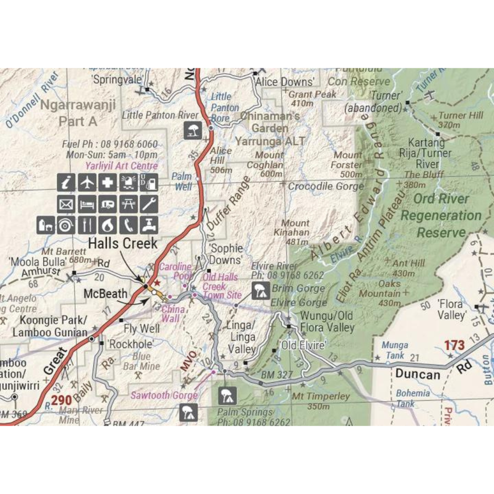 The Great Desert Tracks Central Sheet covers from Judbarra/Gregory National Park in the north to Ceduna in the south, and from Halls Creek in the west to Coober Pedy in the east. Marked on the mapping are roads and 4WD tracks checked by the Hema Map Patrol, distance markers, topographical relief and touring points of interest including 24-hour fuel, camping areas and caravan parks, facilities, services and more. Also included is information on travelling in the desert, what you need for the trip and relevant contact information.