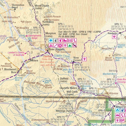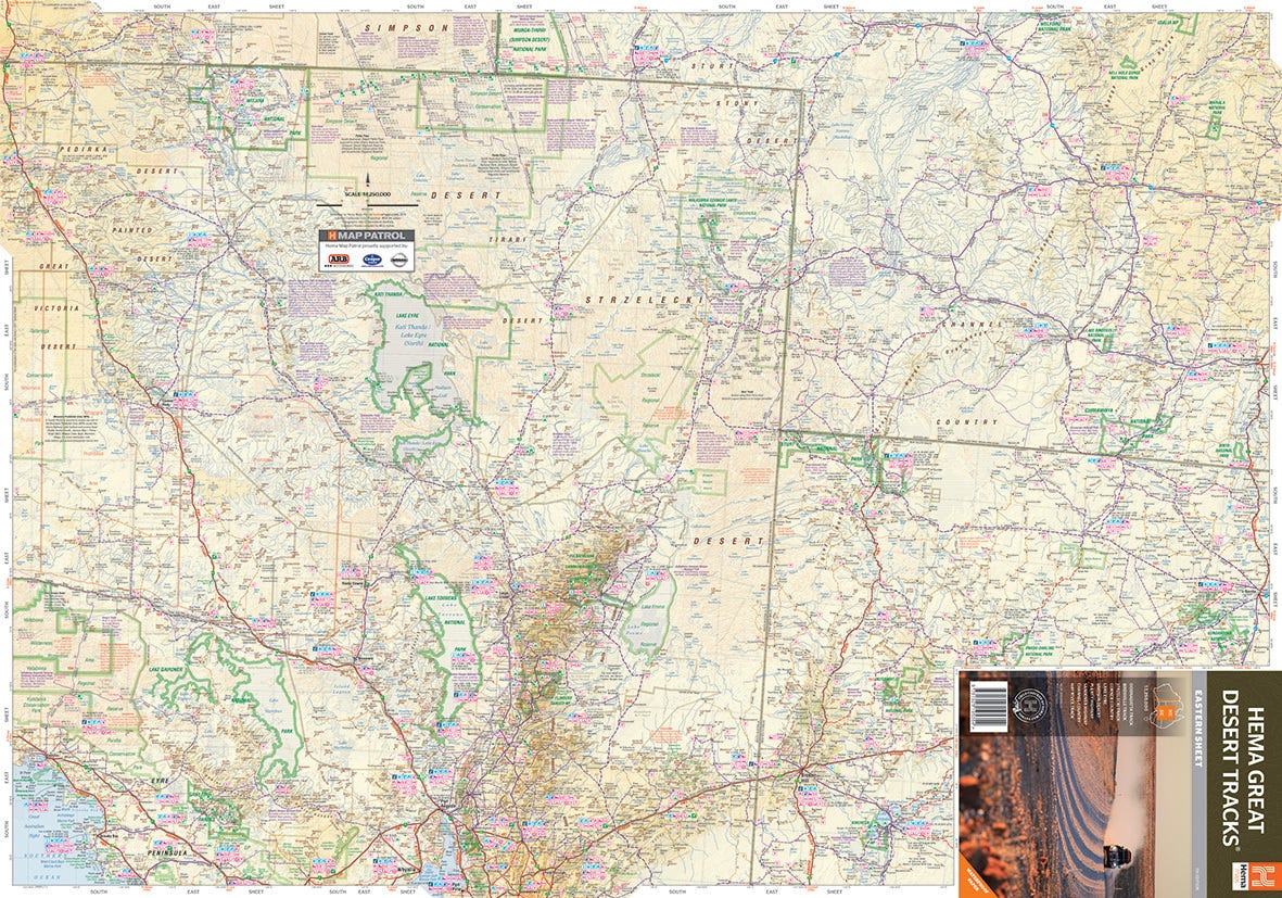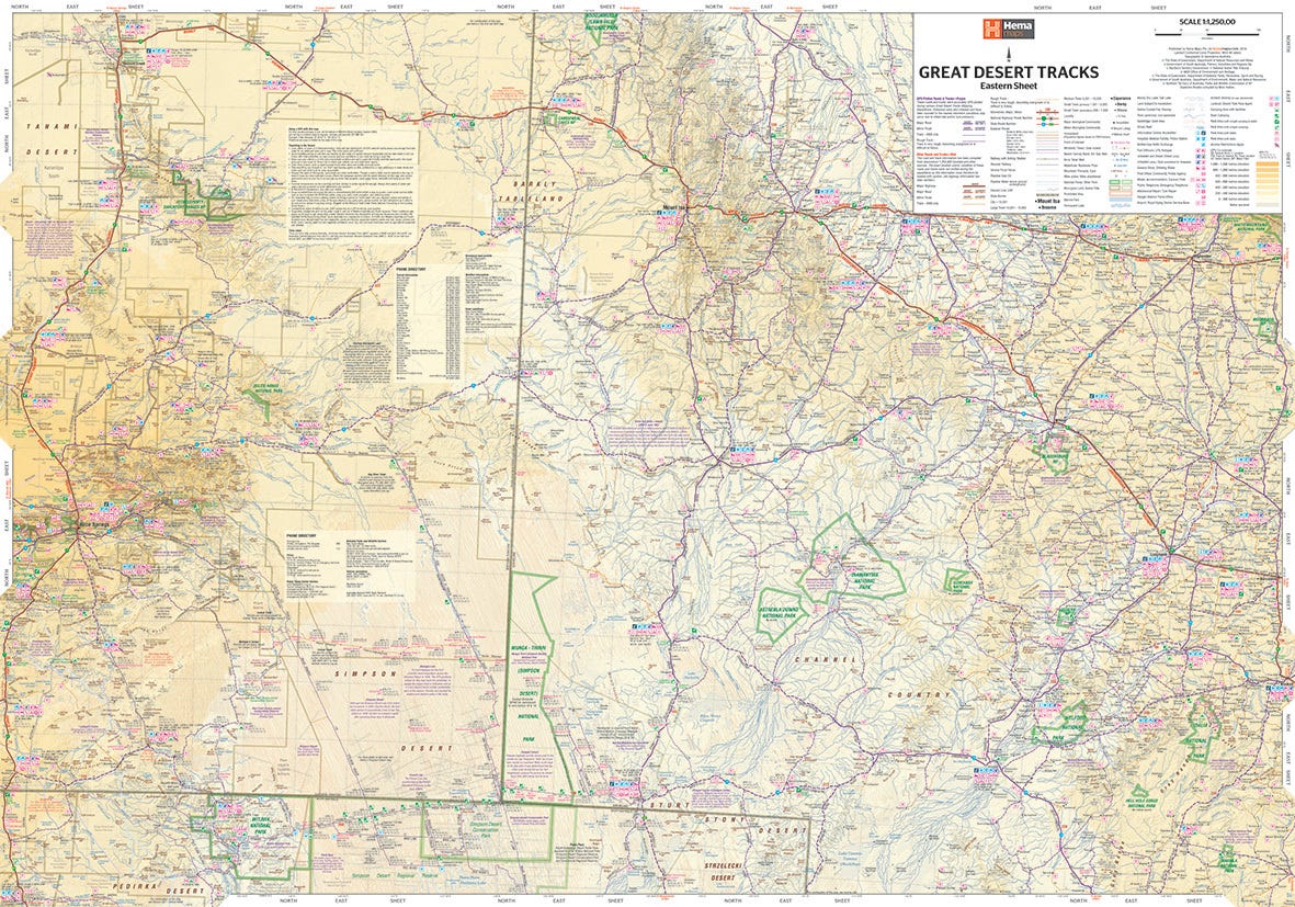 The Great Desert Tracks Eastern Sheet covers from Tennant Creek in the north to Port Pirie in the south, and from Cunamulla in the east to Alice Springs in the west. Marked on the mapping are roads and 4WD tracks checked by the Hema Map Patrol, distance markers, topographical relief and touring points of interest including 24-hour fuel, camping areas and caravan parks, facilities, services and more. Also included is information on travelling in the desert, what you need for the trip and relevant contact information.