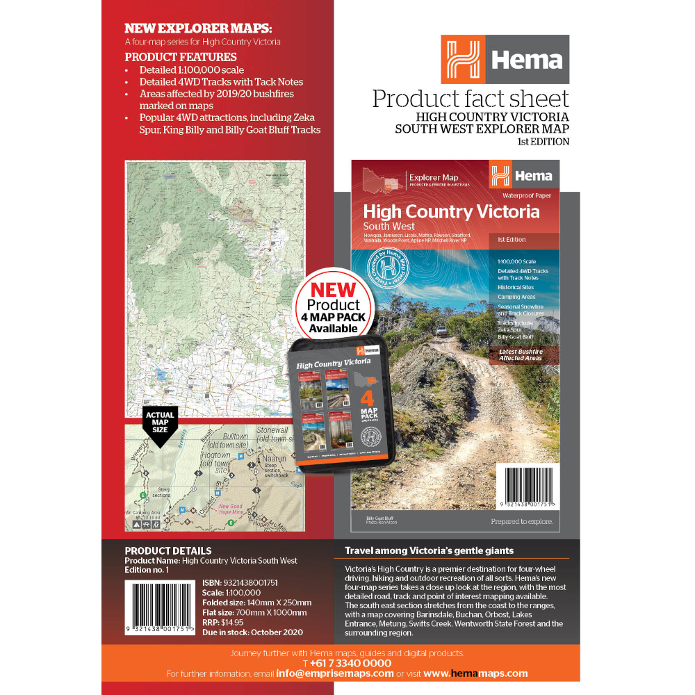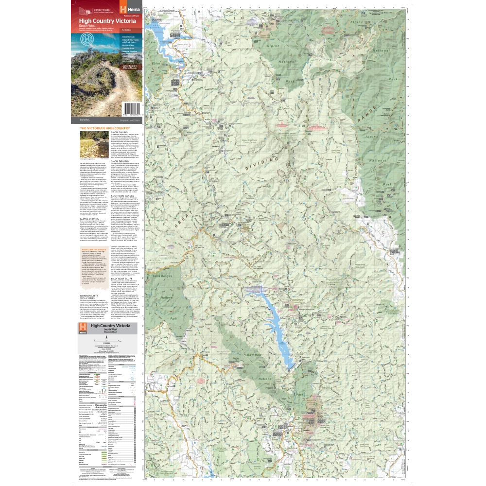 This map is part of Hema's new Victorian High Country Map Series and covers the Southern Ranges Areas including Baw Baw to Dargo and surrounds. Printed on durable waterproof paper, this map features Hema's iconic mapping and extensive points of interest. Featuring roads and 4WD tracks field-checked by the Hema Map Patrol for superior accuracy.