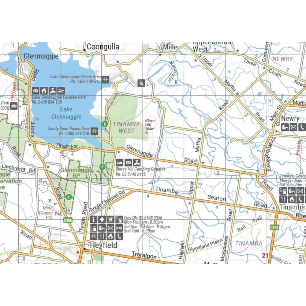 It combines Hema’s entire database of roads and 4WD tracks with touring points of interest and topographic information. Also included are seasonal track closures, camping areas, old townsites, huts, accommodation and distances.