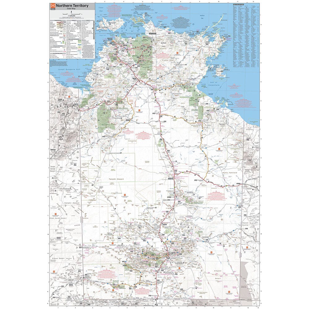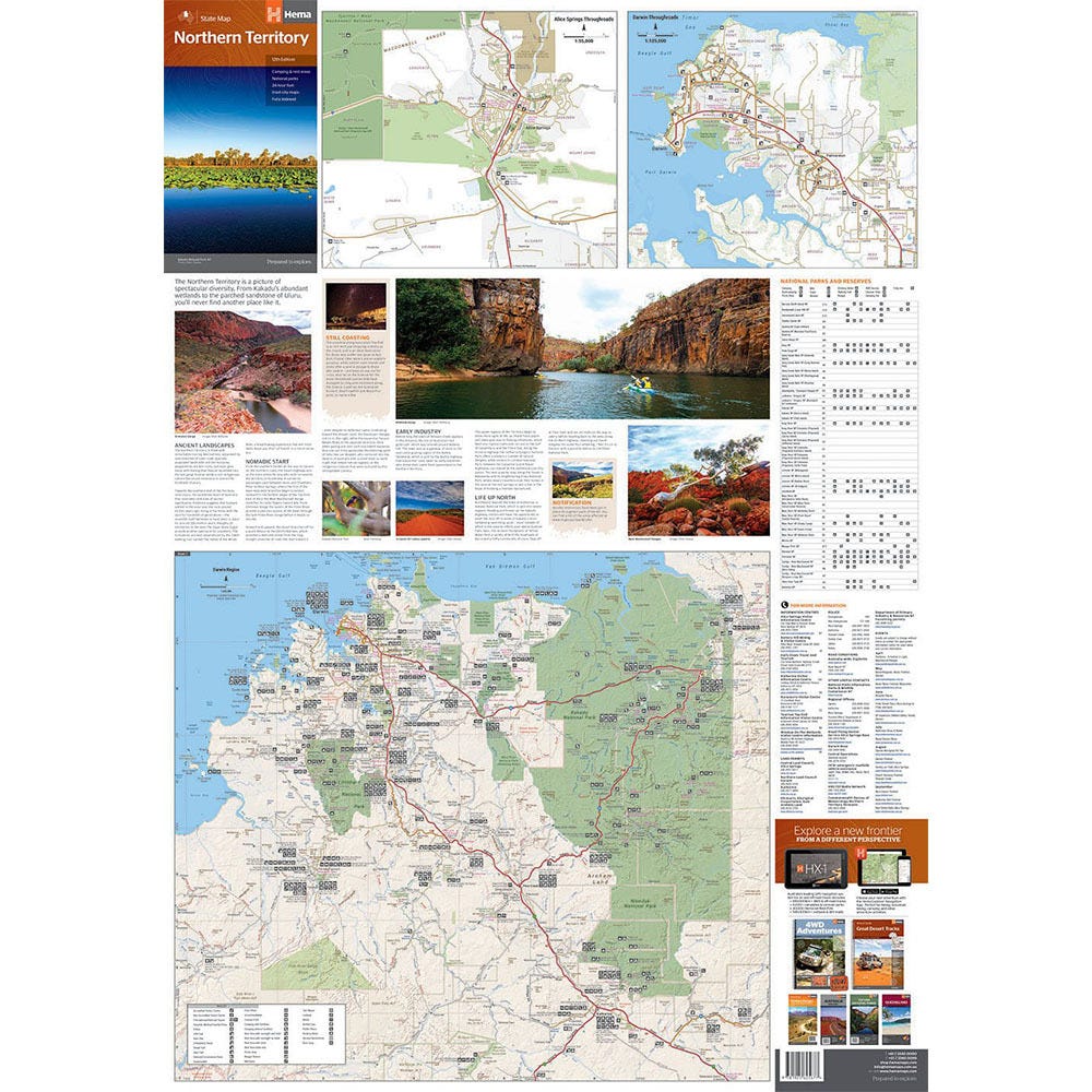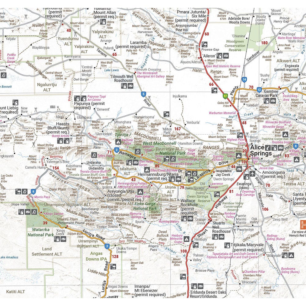 A touring map of the Northern Territory that has camping and rest areas, 24hour fuel and points of interest marked on the mapping. On the reverse are CBD maps of Darwin and Alice Springs, a map of the greater Darwin region and maps of Yulara, Uluru and Kata Tjuta with walking tracks, points of interest and accommodation included. For trip planning, there is a national park matrix and contact details for information centres.