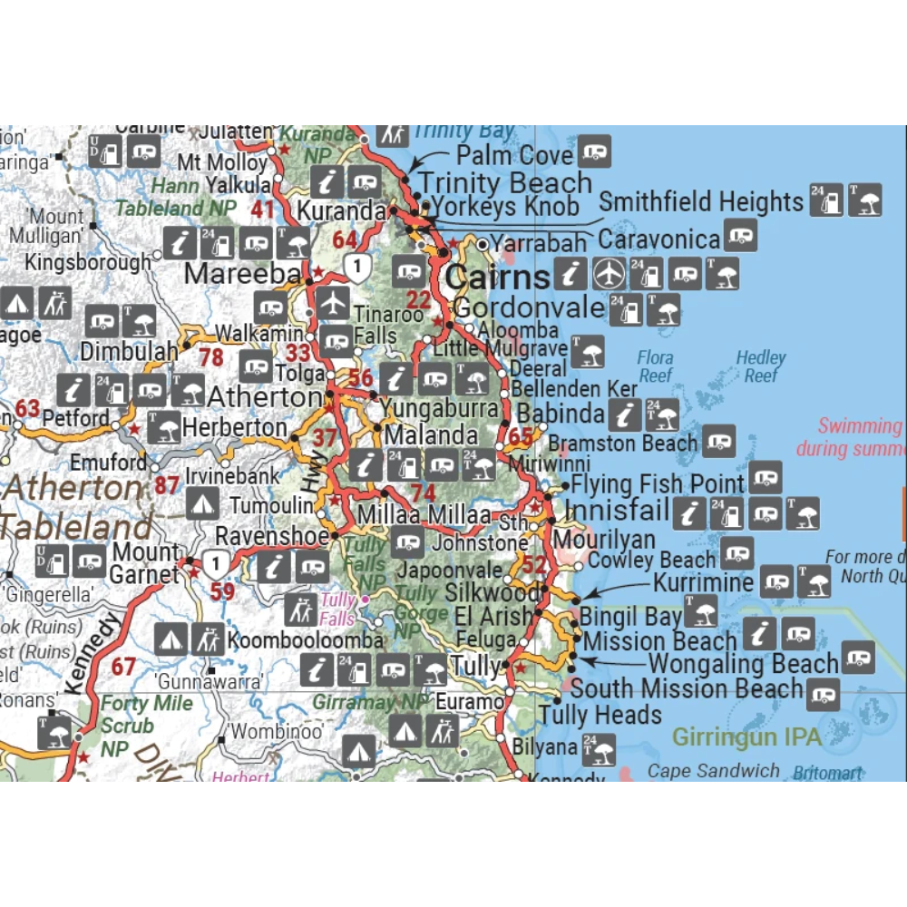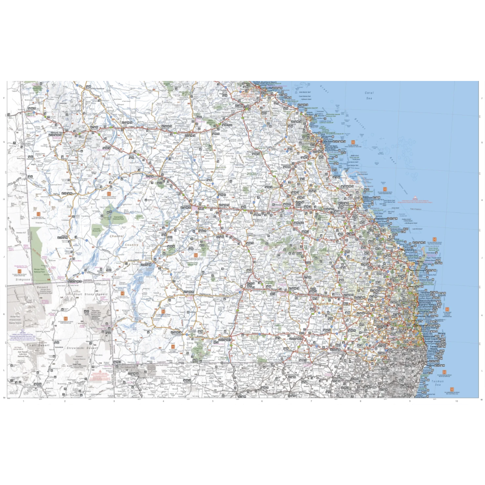 A compact map of Queensland (QLD) at a scale of 1:2,500,000 for touring throughout the state which features highways, major roads and minor roads. Marked on the map are national parks, camping areas, caravan parks, rest areas, points of interest and 24-hour fuel accompanied by a distance grid and an index.