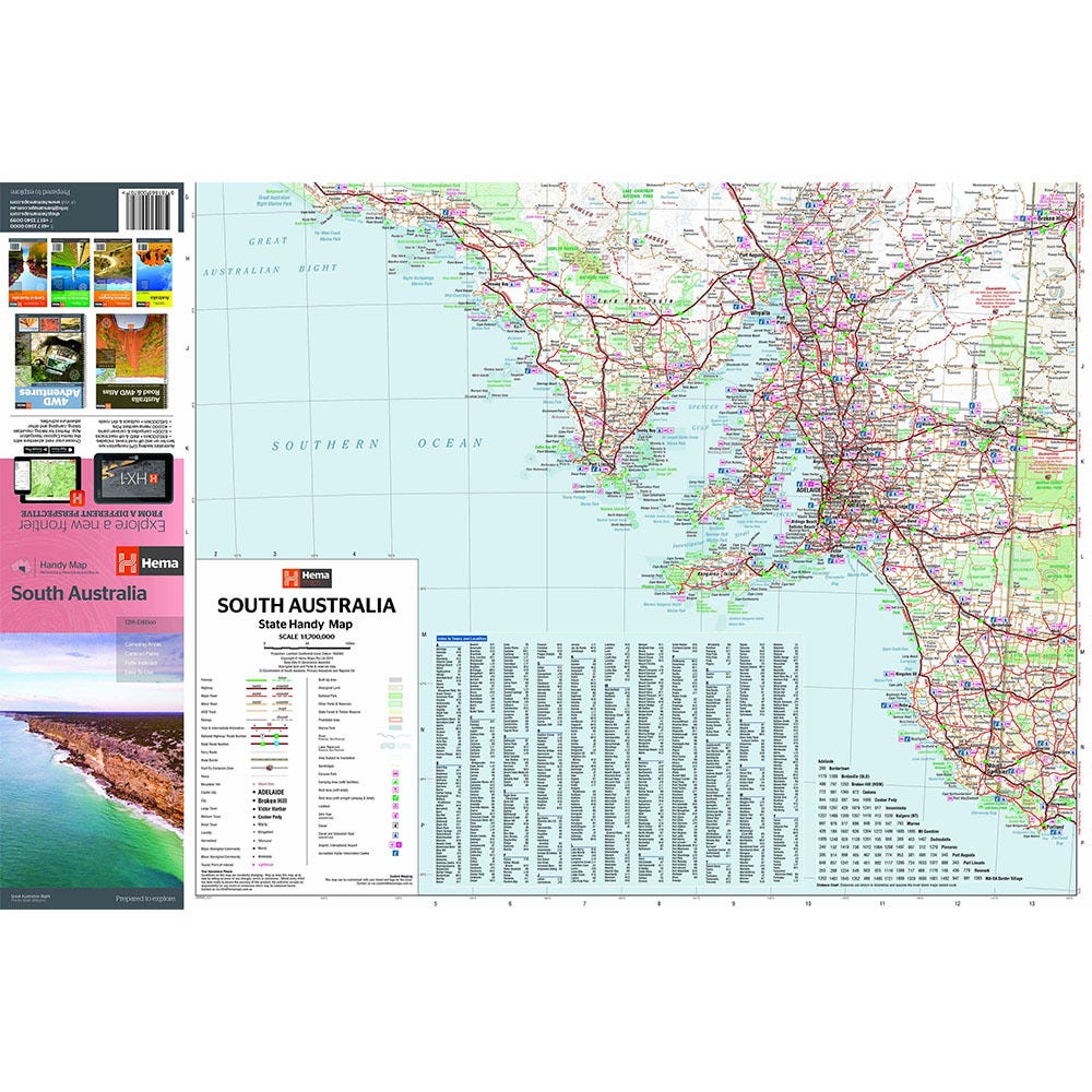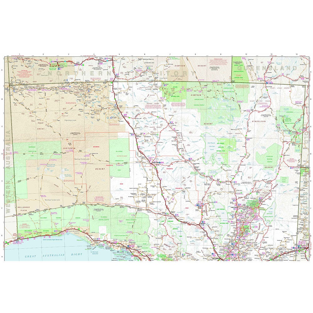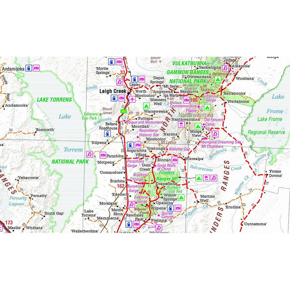 A comprehensive map of South Australia in Hema's distinctive cartography that includes camping areas, caravan parks, points of interest, rest areas and fuel marked on the map for touring throughout the state. Accompanying the mapping is an index of towns and localities and a distance chart.