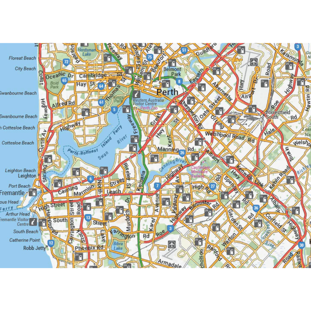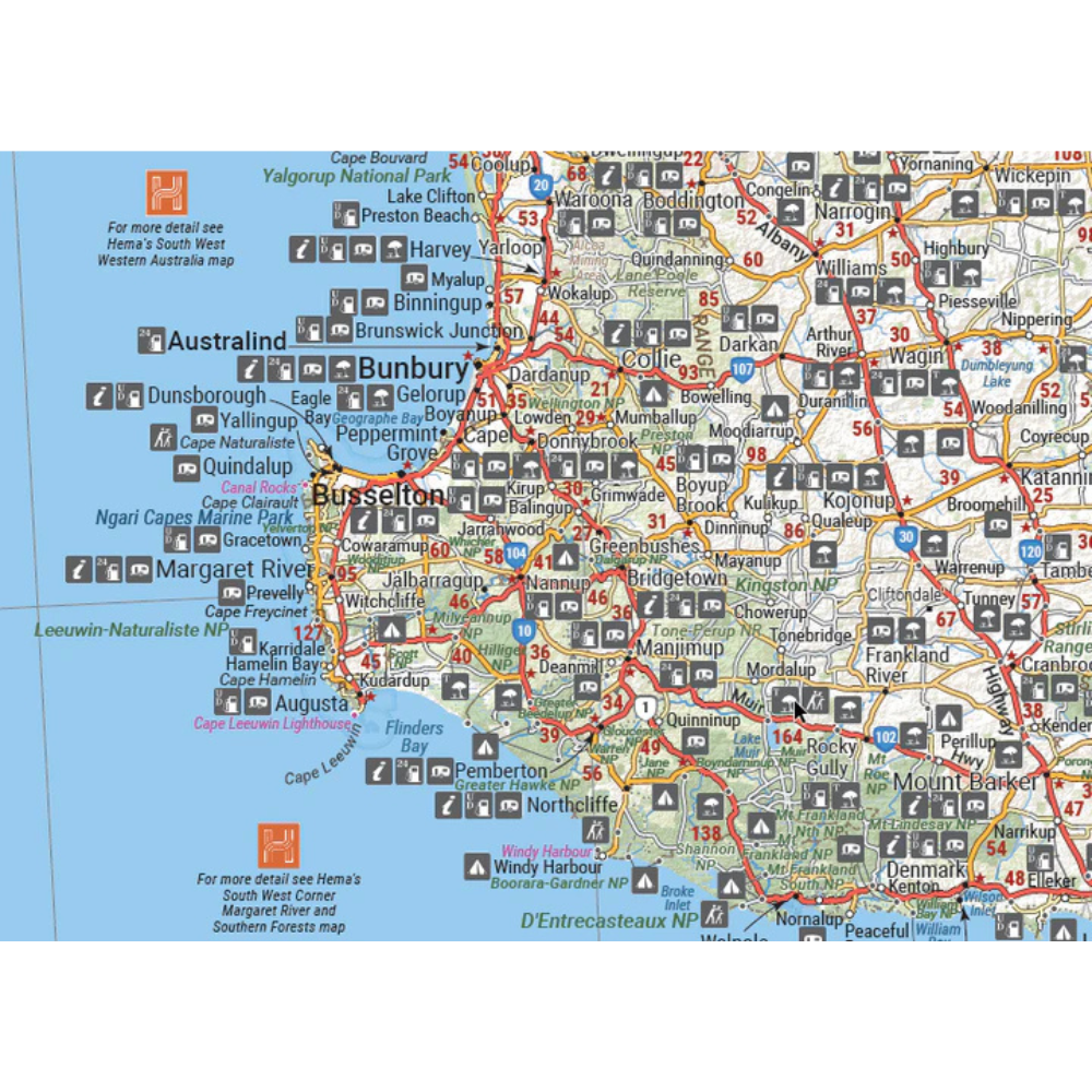 The new and updated 11th edition of the Hema Western Australia state map includes highways, minor and secondary roads, national and state routes, fully-indexed cities, towns and localities as well as detailed road distances. This map includes a map of the full state of Western Australia, as well as inset maps of: