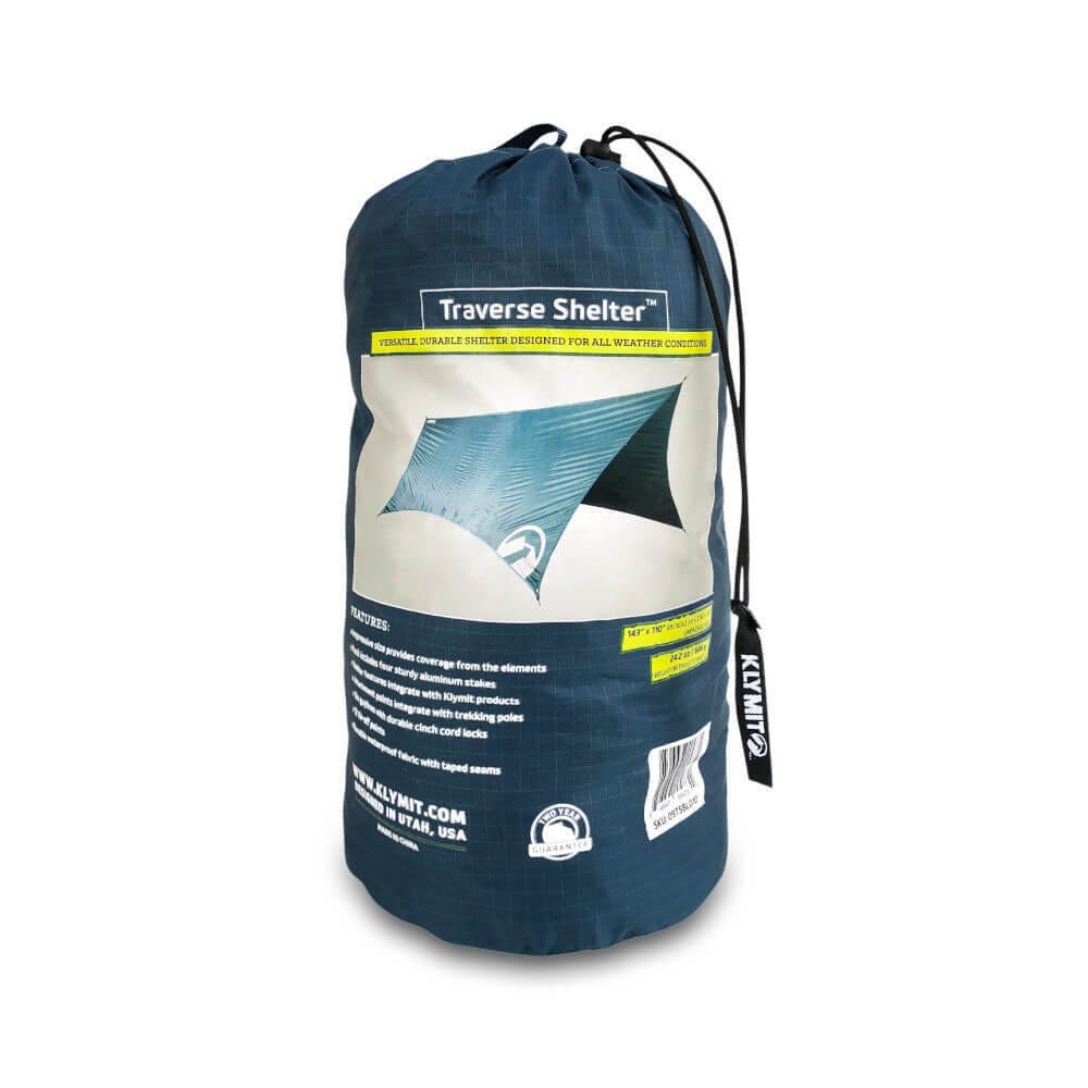 The Klymit Traverse Shelter is a versatile outdoor canopy with a large coverage area measuring 3.63 x 2.79 m. Six tension lock guylines and 12 tie-off points create a customizable surface area. The large triangulated corner guyline easily accommodate the basket of your trekking poles for unique shelter applications. The strong ripstop polyester, taped seams and thick waterproof coating insure that the Traverse Shelter will keep you dry for the long haul.