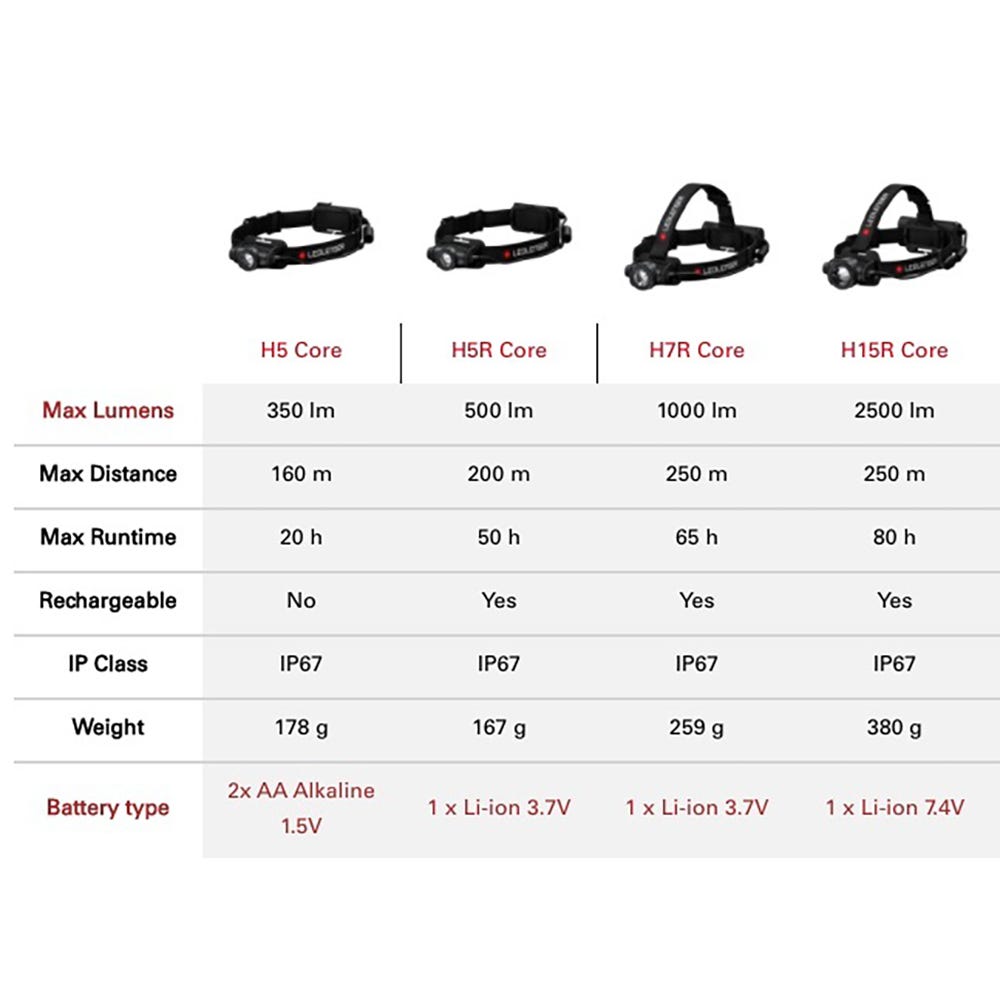 It features a focusable light beam that has continuous dimmability. Thanks to 160-degree lamp head rotation, the H5 Core is ready for many everyday tasks. Additionally, the H5 Core features the Ledlenser Flex Sealing Technology, which provides extremely high protection against dust and water (IP67).This headlamp is compatible with AA or NiMH batteries.