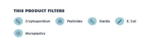 - Filters out contaminants: the Membrane microfilter protects against Bacteria (including E.coli + Salmonella), Parasites (including Giardia and Cryptosporidium), Microplastics, sand, dirt, and cloudiness