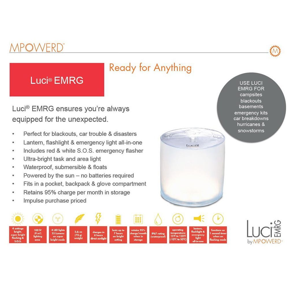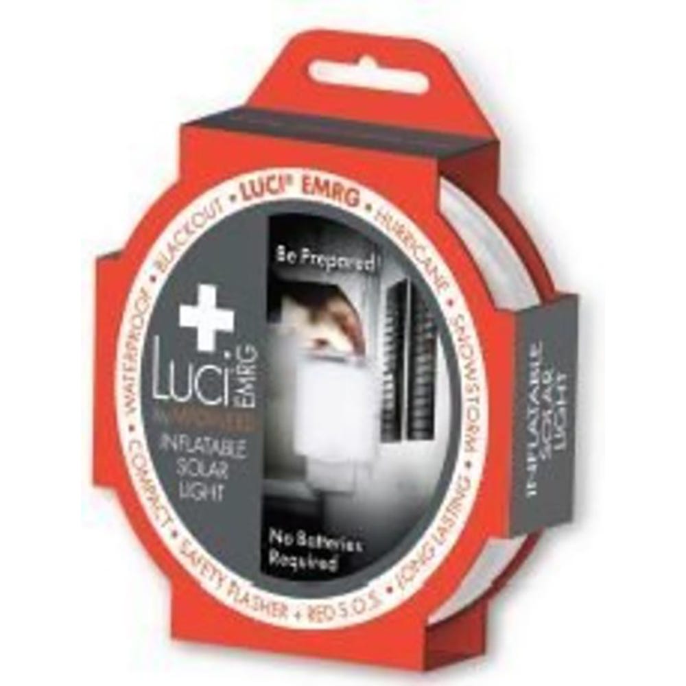 With adjustable flashlight lighting and a high-visibility red emergency S.O.S. flasher, Luci EMRG prepares you for everything that might come your way, from hurricanes and tornadoes to power outages and camping trips. Especially compact (weighs 2.5 ounces), the Luci EMRG fits easily into any drawer, pocket, glove box or toolbox.