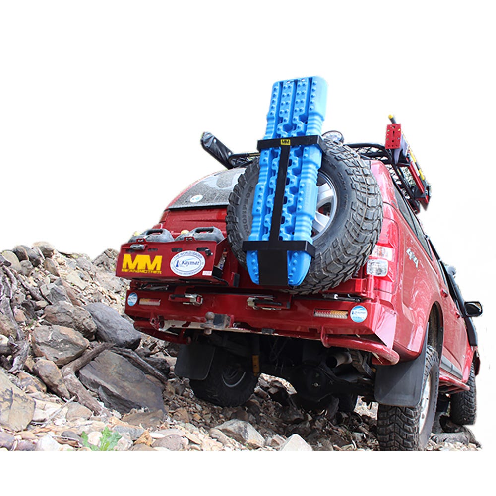 When the situation calls for a set of recovery boards, you want to be able to access them quickly, which is why the Mean Mother Recovery Board Rear Wheel Holder is the perfect addition to an off-road vehicle. The Mean Mother Recovery Board Rear Wheel Holder allows for quick storage, while also preventing dirt and sand from damaging the vehicle's interior. The uniquely designed mounting plate, with its multiple hole positions and knock out sections, will suit a wide variety of wheel carrier bolt patterns and make installation simple. The adjustable mounting arm helps you set the depth of the spare tyre so the bracket mounts squarely against the spare wheel for maximum stability and strength.