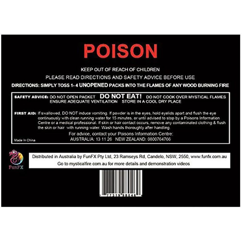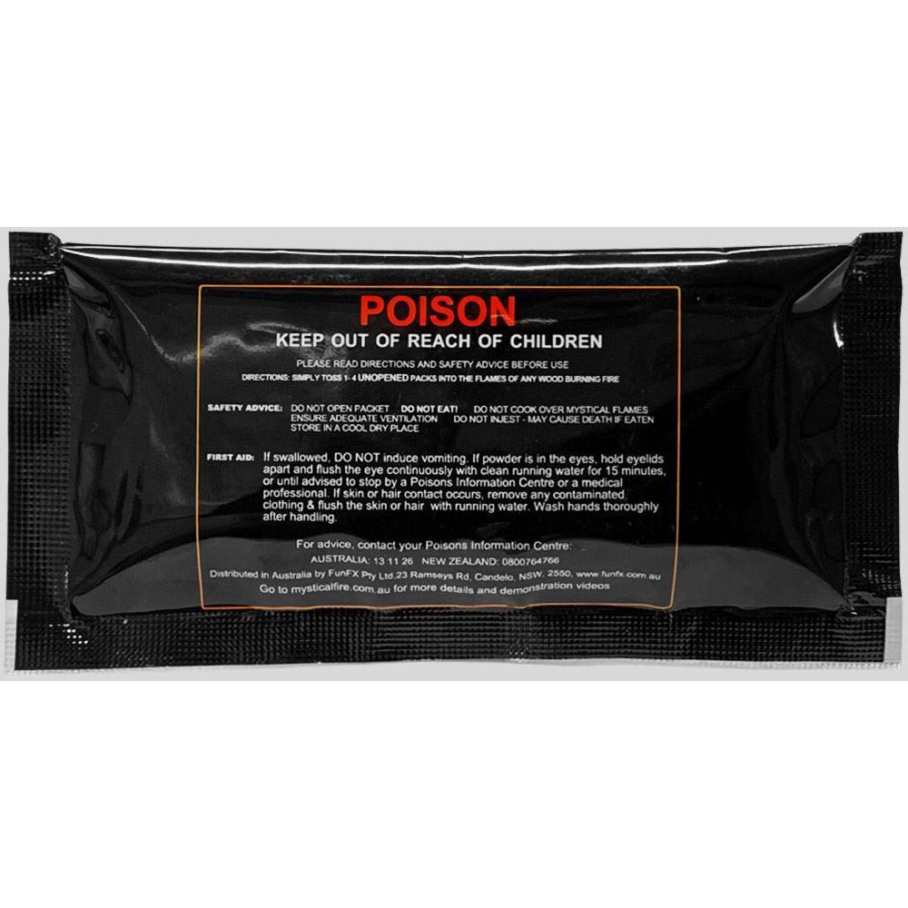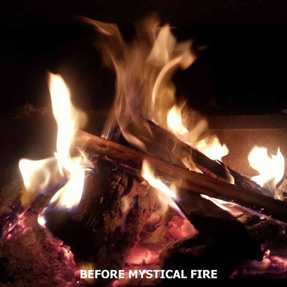 How it works: It's very simple to use Mystical Fire. Simply, toss 1-3 packs into any wood burning fire. Then sit back and enjoy the new vibrant colours that Mystical Fire will produce.