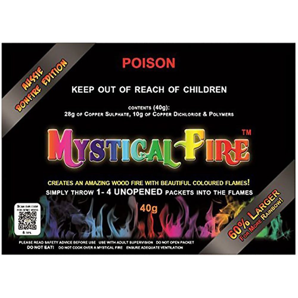 The ever-popular Mystical Fire returns with an expanded packet, increasing the burn-time! The Mystical Fire Aussie Bonfire Edition comes in a package 60% larger than the standard 25g packet. Each package includes 40g of Aussie Bonfire goodness. Impress your mates with a multi-coloured flame that's sure to dazzle.